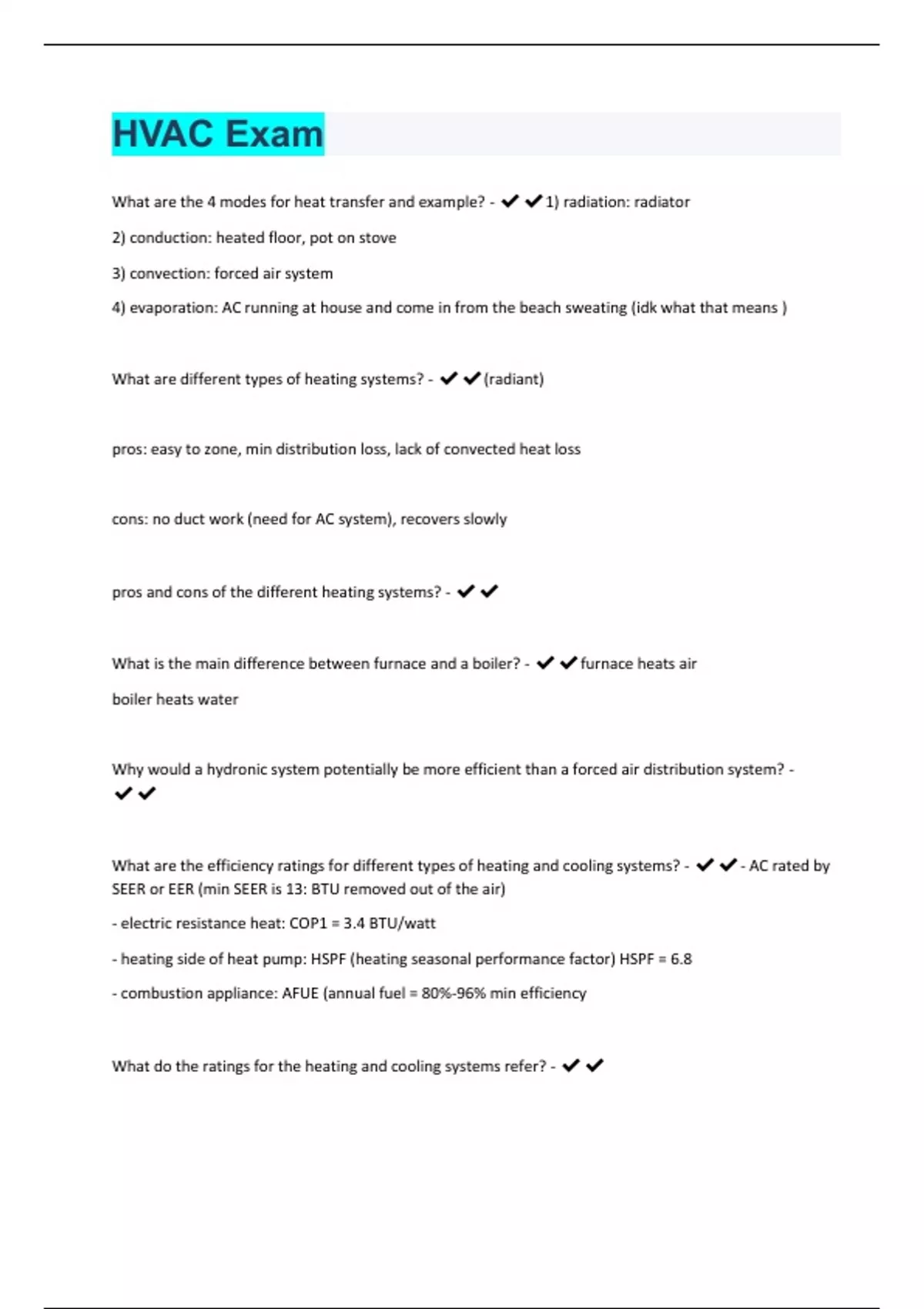 What are the 4 modes for heat transfer and example? - 1) radiation: radiator 2) conduction: heated floor, pot on stove 3) convection: forced air system 4) evaporation: AC running at house and come in from the beach sweating (idk what that means ) What are different types of heating systems? - (radiant) pros: easy to zone, min distribution loss, lack of convected heat loss cons: no duct work (need for AC system), recovers slowly pros and cons of the different heating systems? - What is the main difference between furnace and a boiler? - furnace heats air boiler heats water Why would a hydronic system potentially be more efficient than a forced air distribution system? - What are the efficiency ratings for different types of heating and cooling systems? - - AC rated by SEER or EER (min SEER is 13: BTU removed out of the air) - electric resistance heat: COP1 = 3.4 BTU/watt - heating side of heat pump: HSPF (heating seasonal performance factor) HSPF = 6.8 - combustion appliance: AFUE (annual fuel = 80%-96% min efficiency What do the ratings for the heating and cooling systems refer? - What is the minimum SEER central air conditioner manufactured today? - What are the three types of heat pumps and what makes two to these more efficient designs - 1) air source 2) ground source (so efficient bc cost and temp) 3) water source (so efficient bc cost and temp) Be able to convert Coefficient of Performance to an HSPF and HSPF to a Coefficient of Performance - Be able to list eight items that determine the heating and cooling load of a building - What is the most commonly installed HVAC system in residential construction -natural gas furnace Understand what the SHGC of a window is and the U-Factor and how these effect the performance of the window - 30% of heat makes it through the glass - ufactor=conductance (inverse of R value) What does HVAC stand for? - heating ventilation and air conditioning Do houses typically have mechanical ventilation systems? - houses do have ventilation systems but typically do not (not tight enough or have enough occupants to need one) What are the two key pieces of information on a window sticker determine its efficiency - Be able to draw a sketch of the refrigeration cycle (slide 29 HVAC Intro P.P.) - What is a Heat Pump and how does it work (slide 26 HVAC Intro P.P.) - What are the two types of cooling provided by an air conditioner? - latent: sensible: Understand the relationship between the coils in a heat pump and their location during the heating and cooling season -