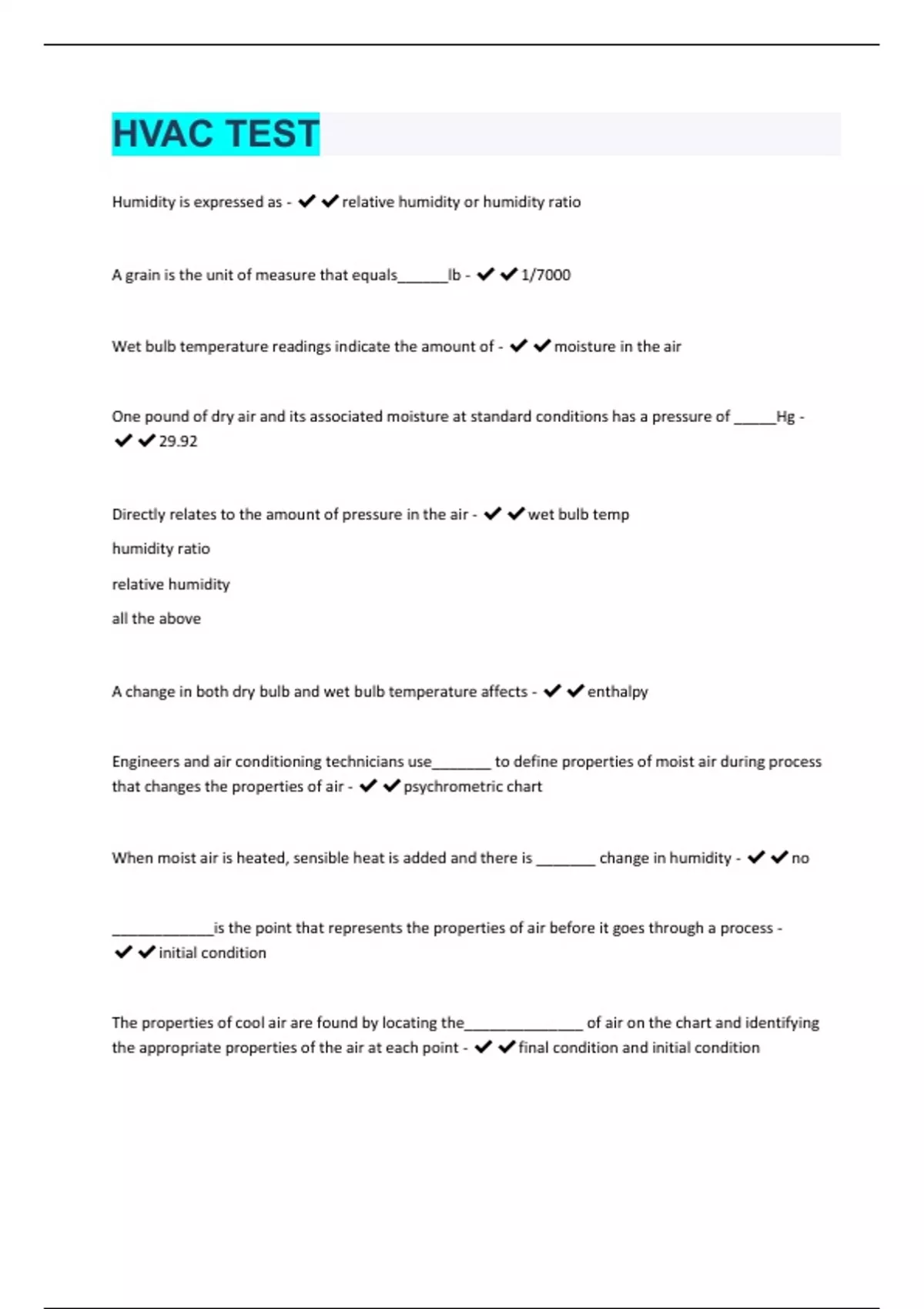 Humidity is expressed as - relative humidity or humidity ratio A grain is the unit of measure that equals______lb - 1/7000 Wet bulb temperature readings indicate the amount of - moisture in the air One pound of dry air and its associated moisture at standard conditions has a pressure of _____Hg - 29.92 Directly relates to the amount of pressure in the air - wet bulb temp humidity ratio relative humidity all the above A change in both dry bulb and wet bulb temperature affects - enthalpy Engineers and air conditioning technicians use_______ to define properties of moist air during process that changes the properties of air - psychrometric chart When moist air is heated, sensible heat is added and there is _______ change in humidity - no ____________is the point that represents the properties of air before it goes through a process - initial condition The properties of cool air are found by locating the______________ of air on the chart and identifying the appropriate properties of the air at each point -final condition and initial condition_____________ is the measurement of sensible heat - dry bulb temp Humidity can be measured with a - psychrometer or hygrometer If the dry bulb volume temp decreases, the specific volume will________________ - decrease Enthalpy is the sum of latent and _______heat - sensible ________ is the volume of a substance per unit of the substance - specific volume Enthably is expressed in - BTU per pound relative humidity is _________% at the saturation line - 100% Resistance (R-factor) in construction is defined as - index of material's tendency to impede heat flow The higher the "R" value - the lower the "U" value is the process of introducing fresh air into the building - ventilation