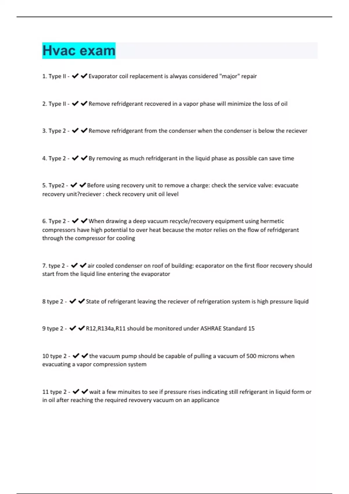 1. Type II - Evaporator coil replacement is alwyas considered "major" repair 2. Type II - Remove refridgerant recovered in a vapor phase will minimize the loss of oil 3. Type 2 - Remove refridgerant from the condenser when the condenser is below the reciever 4. Type 2 - By removing as much refridgerant in the liquid phase as possible can save time 5. Type2 - Before using recovery unit to remove a charge: check the service valve: evacuate recovery unit?reciever : check recovery unit oil level 6. Type 2 - When drawing a deep vacuum recycle/recovery equipment using hermetic compressors have high potential to over heat because the motor relies on the flow of refridgerant through the compressor for cooling 7. type 2 - air cooled condenser on roof of building: ecaporator on the first floor recovery should start from the liquid line entering the evaporator 8 type 2 - State of refrigerant leaving the reciever of refrigeration system is high pressure liquid 9 type 2 - R12,R134a,R11 should be monitored under ASHRAE Standard 15 10 type 2 - the vacuum pump should be capable of pulling a vacuum of 500 microns when evacuating a vapor compression system 11 type 2 - wait a few minuites to see if pressure rises indicating still refrigerant in liquid form or in oil after reaching the required revovery vacuum on an applicance12 Type 2 - Pressure relief device should protectevery refrigerant system 13 type 2 - replace filter drier if a system is opened for servicing 14 type 2 - because of an open equalization connection refrigerant cannot be recoverd without isolating a parallel compressor system