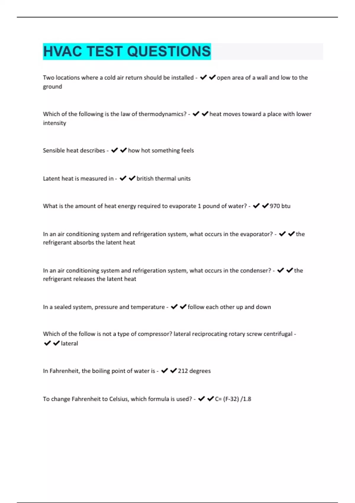 HVAC TEST QUESTIONS AND ANSWERS | VERIFIED