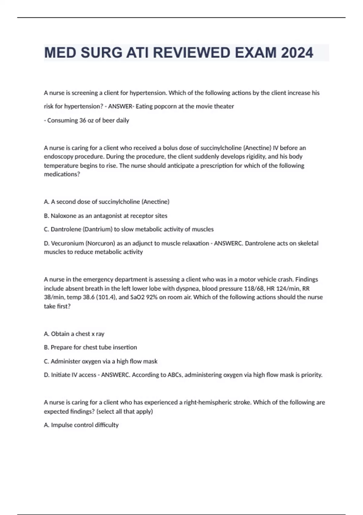 MED SURG ATI REVIEW EXAM WITH ANSWER A nurse is screening a client for hypertension. Which of the following actions by the client increase his risk for hypertension? - Eating popcorn at the movie theater - Consuming 36 oz of beer daily A nurse is caring for a client who received a bolus dose of succinylcholine (Anectine) IV before an endoscopy procedure. During the procedure, the client suddenly develops rigidity, and his body temperature begins to rise. The nurse should anticipate a prescription for which of the following medications? A. A second dose of succinylcholine (Anectine) B. Naloxone as an antagonist at receptor sites C. Dantrolene (Dantrium) to slow metabolic activity of muscles D. Vecuronium (Norcuron) as an adjunct to muscle relaxation C. Dantrolene acts on skeletal muscles to reduce metabolic activity Brainpower Read More Previous Play Next Rewind 10 seconds Move forward 10 seconds Unmute 0:11 / 0:15 Full screen A nurse in the emergency department is assessing a client who was in a motor vehicle crash. Findings include absent breath in the left lower lobe with dyspnea, blood pressure 118/68, HR 124/min, RR 38/min, temp 38.6 (101.4), and SaO2 92% on room air. Which of the following actions should the nurse take first? A. Obtain a chest x ray B. Prepare for chest tube insertion C. Administer oxygen via a high flow mask D. Initiate IV access