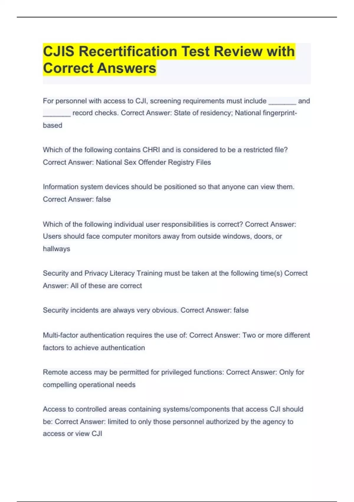 CJIS Recertification Test Review with Correct Answers For personnel with access to CJI, screening requirements must include _______ and _______ record checks. Correct Answer: State of residency; National fingerprint-based Which of the following contains CHRI and is considered to be a restricted file? Correct Answer: National Sex Offender Registry Files Information system devices should be positioned so that anyone can view them. Correct Answer: false Which of the following individual user responsibilities is correct? Correct Answer: Users should face computer monitors away from outside windows, doors, or hallways Security and Privacy Literacy Training must be taken at the following time(s) Correct Answer: All of these are correct Security incidents are always very obvious. Correct Answer: false Multi-factor authentication requires the use of: Correct Answer: Two or more different factors to achieve authentication Remote access may be permitted for privileged functions: Correct Answer: Only for compelling operational needs Access to controlled areas containing systems/components that access CJI should be: Correct Answer: limited to only those personnel authorized by the agency to access or view CJI Unauthorized requests, receipt, release, interception, dissemination, or discussion of CJI is serious and may result in: Correct Answer: All of these are correct The perimeter of the area requiring physical security should be prominently posted. Correct Answer: True If electronic media cannot be physically destroyed, it must be _______ to prevent unauthorized access to previously stored data. Correct Answer: Overwritten at least three times The security principle of _______ is where individuals are granted only the most restrictive set of access privileges required to perform their official duties. Correct Answer: Least privilege All training records must be kept current and be maintained for a minimum of three years. Correct Answer: True After the initial training, how often must Security and Privacy Training be completed? Correct Answer: Every year An example of a possible threat to security and privacy is a user accidentally erasing a critical file while "playing" on the computer. Correct Answer: True Any incidents or unusual activity should be reported to your agency contact, LASO, or Information Security Officer immediately. Correct Answer: True The FBI authorized originating agency identifier (ORI) must be used in each transaction on CJIS systems. Correct Answer: True Authorized criminal justice purposes for the use of CJI include: Correct Answer: All of these are correct A security incident is a violation of the CJIS Security Policy that threatens the confidentiality, integrity, or availability of CJI. Correct Answer: True A commonly used type of social engineering is: Correct Answer: All of these are correct Encryption is: Correct Answer: The process of converting information or data into a code to prevent unauthorized access Access to and use of CJI and CHRI is for: Correct Answer: Criminal justice purposes and authorized noncriminal justice functions only An authentication factor is: Correct Answer: All of these are correct CJI can include which of the following types of data? Correct Answer: All of these are correct