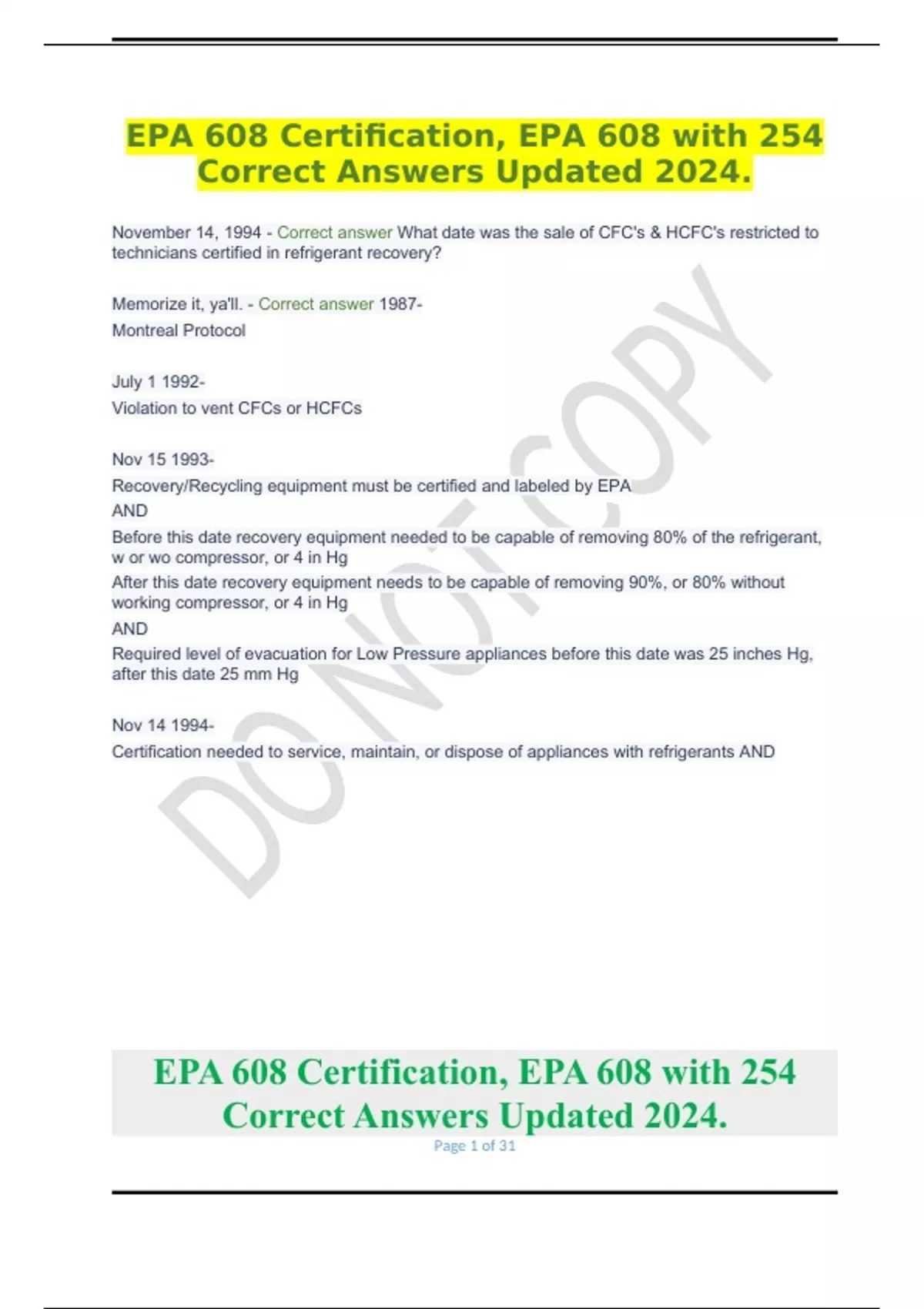EPA 608 Certification, EPA 608 with 254 Correct Answers Updated 2024..EPA 608 Certification, EPA 608 with 254 Correct Answers Updated 2024..