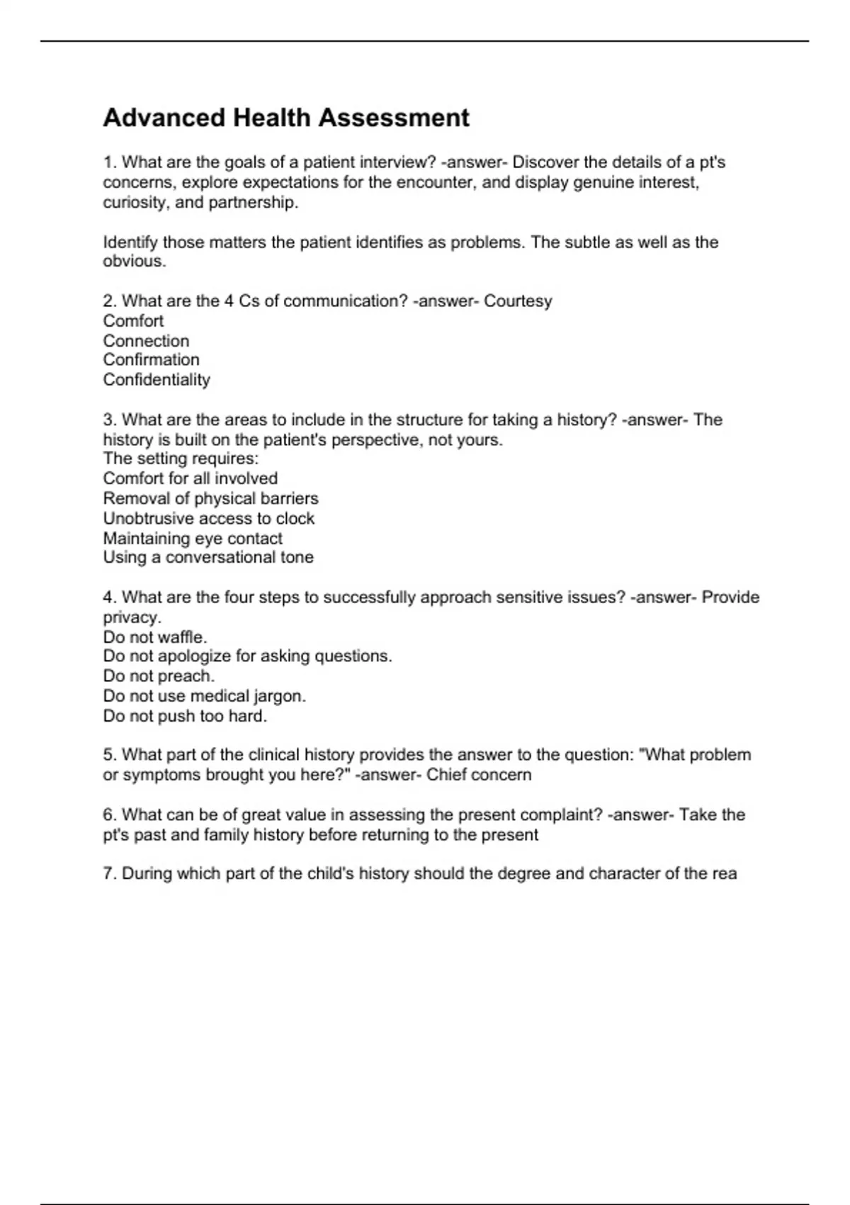 1. What are the goals of a patient interview? -answer- Discover the details of a pt's concerns, explore expectations for the encounter, and display genuine interest, curiosity, and partnership. Identify those matters the patient identifies as problems. The subtle as well as the obvious. 2. What are the 4 Cs of communication? -answer- Courtesy Comfort Connection Confirmation Confidentiality 3. What are the areas to include in the structure for taking a history? -answer- The history is built on the patient's perspective, not yours. The setting requires: Comfort for all involved Removal of physical barriers Unobtrusive access to clock Maintaining eye contact Using a conversational tone 4. What are the four steps to successfully approach sensitive issues? -answer- Provide privacy. Do not waffle. Do not apologize for asking questions.