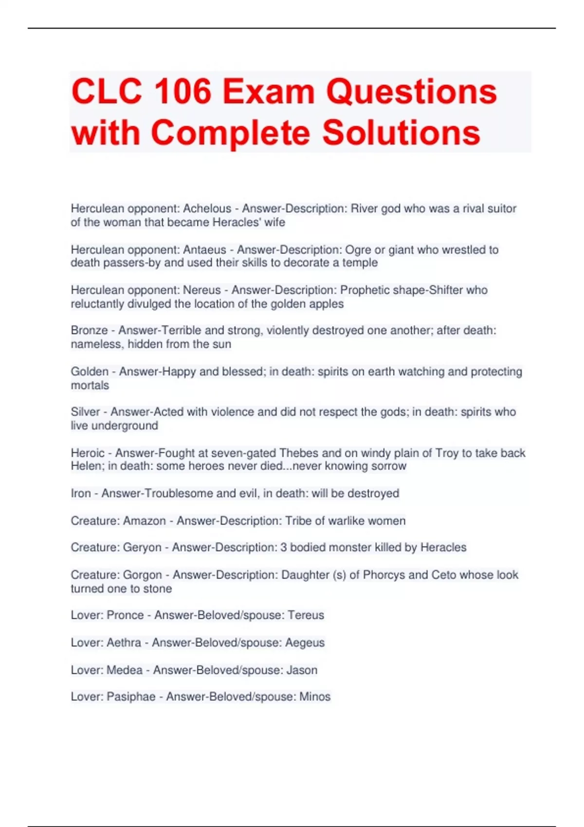 CLC 106 Exam Questions with Complete Solutions Herculean opponent: Achelous - Answer-Description: River god who was a rival suitor of the woman that became Heracles' wife Herculean opponent: Antaeus - Answer-Description: Ogre or giant who wrestled to death passers-by and used their skills to decorate a temple Herculean opponent: Nereus - Answer-Description: Prophetic shape-Shifter who reluctantly divulged the location of the golden apples Bronze - Answer-Terrible and strong, violently destroyed one another; after death: nameless, hidden from the sun Golden - Answer-Happy and blessed; in death: spirits on earth watching and protecting mortals Silver - Answer-Acted with violence and did not respect the gods; in death: spirits who live underground Heroic - Answer-Fought at seven-gated Thebes and on windy plain of Troy to take back Helen; in death: some heroes never died...never knowing sorrow Iron - Answer-Troublesome and evil, in death: will be destroyed Creature: Amazon - Answer-Description: Tribe of warlike women Creature: Geryon - Answer-Description: 3 bodied monster killed by Heracles Creature: Gorgon - Answer-Description: Daughter (s) of Phorcys and Ceto whose look turned one to stone