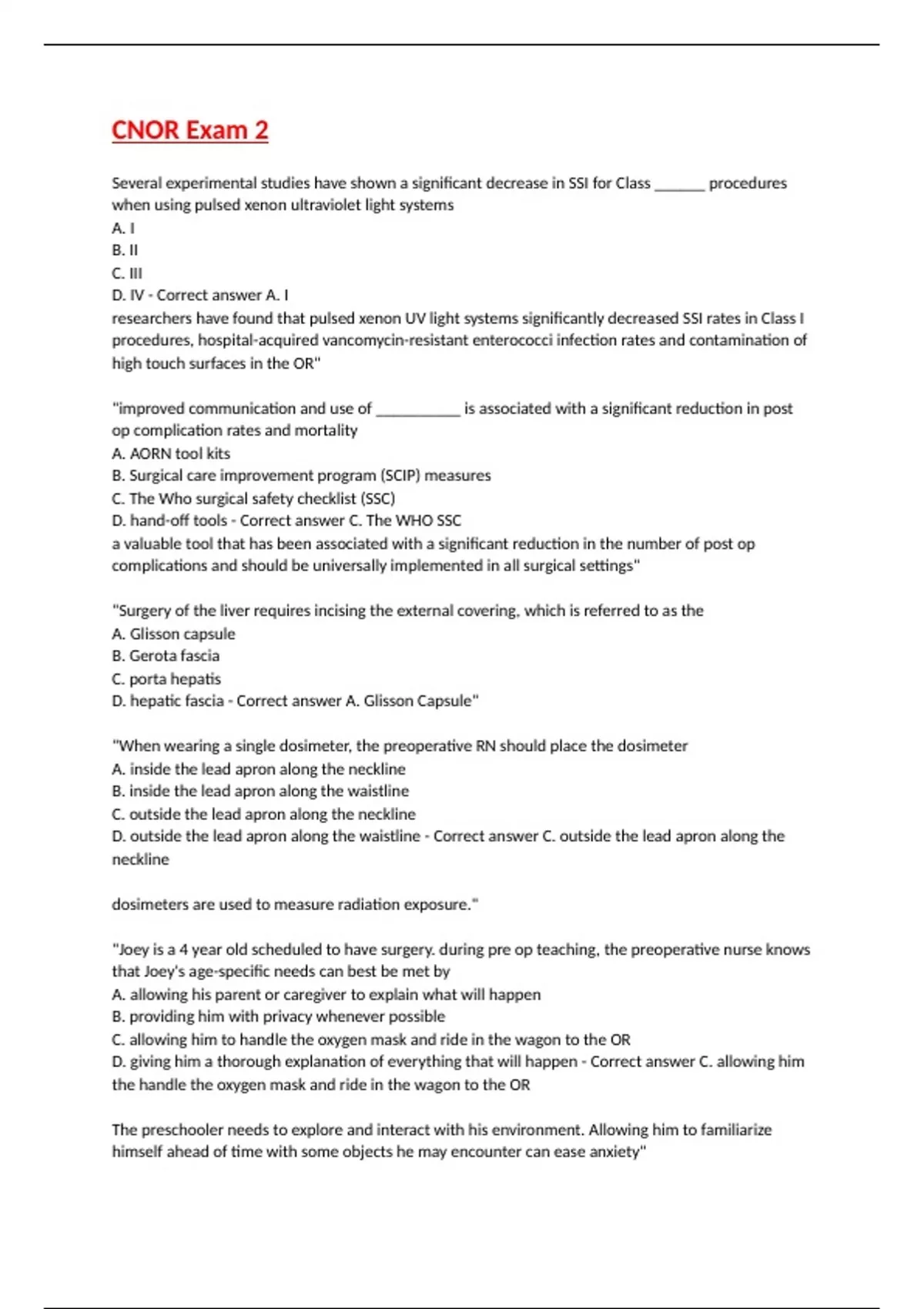 CNOR Exam 2 Several experimental studies have shown a significant decrease in SSI for Class ______ procedures when using pulsed xenon ultraviolet light systems A. I B. II C. III D. IV - Correct answer A. I researchers have found that pulsed xenon UV light systems significantly decreased SSI rates in Class I procedures, hospital-acquired vancomycin-resistant enterococci infection rates and contamination of high touch surfaces in the OR" "improved communication and use of __________ is associated with a significant reduction in post op complication rates and mortality A. AORN tool kits B. Surgical care improvement program (SCIP) measures C. The Who surgical safety checklist (SSC) D. hand-off tools - Correct answer C. The WHO SSC a valuable tool that has been associated with a significant reduction in the number of post op complications and should be universally implemented in all surgical settings" "Surgery of the liver requires incising the external covering, which is referred to as the A. Glisson capsule B. Gerota fascia C. porta hepatis D. hepatic fascia - Correct answer A. Glisson Capsule" "When wearing a single dosimeter, the preoperative RN should place the dosimeter A. inside the lead apron along the neckline B. inside the lead apron along the waistline C. outside the lead apron along the neckline D. outside the lead apron along the waistline - Correct answer C. outside the lead apron along the neckline dosimeters are used to measure radiation exposure." "Joey is a 4 year old scheduled to have surgery. during pre op teaching, the preoperative nurse knows that Joey's age-specific needs can best be met by A. allowing his parent or caregiver to explain what will happen B. providing him with privacy whenever possible C. allowing him to handle the oxygen mask and ride in the wagon to the OR D. giving him a thorough explanation of everything that will happen - Correct answer C. allowing him the handle the oxygen mask and ride in the wagon to the OR The preschooler needs to explore and interact with his environment. Allowing him to familiarize himself ahead of time with some objects he may encounter can ease anxiety" "flammable antiseptic solutions differ from combustible ones in that A. flammable solutions have a flash point above 101.5 F B. flammable solutions will not ignite C. combustible solutions have a flash point above 100.0 F D. Combustible solutions will not ignite - Correct answer C. combustible solutions have a flash point above 100.0 The threshold between flammable and combustible solutions is the flash point of 100.0 F, with flammable ones being below this temperature and combustible ones being above. all saturated flammable solutions should be removed prior to draping the patient. Fumes from volatile or combustible solutions may ignite w/o a direct connection to the source of ignition." "Which of the following is the most important action by the circulating nurse to reduce specimen error? A. seeking clarification from the surgeon about the specimen site and side B. calling the lab to confirm the proper storage solution for the specimen C. asking the scrub person to verify the specimen D. paging the surgical assistant post op to identify the specimen - Correct answer A. seek clarification from the surgeon about the specimen site and side" "using the nursing process, nursing interventions lead to A. planning B. implementation C. assessment D. outcomes identification - Correct answer D. outcomes identification outcomes identification describes the desired patient condition that can be achieved through nursing interventions" "a hemostatic agent that may be used by a neurosurgeon to control bleeding bone is A. heparin B. protamine sulfate C. methylene blue D. bone wax - Correct answer D. Bone Wax Bone Wax is a hemostatic agent used to control bleeding from open bone via the creation of a mechanical tamponade barrier" "When delegating a task, the circulating nurse should A. verify that the task is with in the scope of practice of the designee B. provide a minimum of instructions on how to complete the task C. give feedback to the designee based on personal experience D. assume the designee has the skills to perform the task - Correct answer A. verify that the task in within the scope of practice of the designee" "A medication that should be administered for treatment of local anesthetic systemic toxicity (LAST) crisis is A. lidocaine B. epinephrine C. 20% lipid emulsion D. propofol - Correct answer C. 20% lipid emulsion The lipid emulsion is used to draw the local anesthetic out of the bloodstream" "hospital policy should include the requirement of PPE for all personnel who are likely to come in contact with blood or infectious material based on A. OSHA regulations B. TJC standards C. AORN guidelines D. CDC recommendations - Correct answer A. OSHA regulations hospital policy must comply with OSHA regulations" "When double gloving, personnel should wear A. gloves one size larger for the first layer B. gloves one size smaller for the first layer C. gloves that are the same size for both layers D. hypoallergenic gloves for the outer layer - Correct answer A. gloves one size large for the first layer using an inner glove that is one size larger allows for an air pocket that will prevent constriction when the outer glove is applied." "Which of the following core body temperatures would indicate post op hypothermia? A. 36 C B. 37 C C. 38 C D. 39 C - Correct answer A. 36 C post op hypothermia, which can prolong recovery time and contribute to post op morbidity, is defined as a core body temp less than 36 C (96.9 F)" "The power drill or saw used to divided bone with a side-to-side cutting action is a/an A. reciprocating saw B. oscillating saw C. drill D. reamer - Correct answer B. Oscillating saw reciprocating saw uses and in-and-out action the drill and reamer both use a rotary action" "Deviation from a standardized procedure that is hospital policy suggests the need for A. a root cause 
