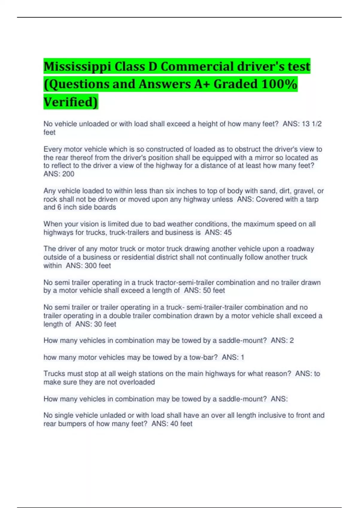 Mississippi Class D Commercial driver's test (Questions and Answers A+ Graded 100% Verified) No vehicle unloaded or with load shall exceed a height of how many feet? ANS: 13 1/2 feet Every motor vehicle which is so constructed of loaded as to obstruct the driver's view to the rear thereof from the driver's position shall be equipped with a mirror so located as to reflect to the driver a view of the highway for a distance of at least how many feet? ANS: 200 Any vehicle loaded to within less than six inches to top of body with sand, dirt, gravel, or rock shall not be driven or moved upon any highway unless ANS: Covered with a tarp and 6 inch side boards When your vision is limited due to bad weather conditions, the maximum speed on all highways for trucks, truck-trailers and business is ANS: 45 The driver of any motor truck or motor truck drawing another vehicle upon a roadway outside of a business or residential district shall not continually follow another truck within ANS: 300 feet No semi trailer operating in a truck tractor-semi-trailer combination and no trailer drawn by a motor vehicle shall exceed a length of ANS: 50 feet No semi trailer or trailer operating in a truck- semi-trailer-trailer combination and no trailer operating in a double trailer combination drawn by a motor vehicle shall exceed a length of ANS: 30 feet How many vehicles in combination may be towed by a saddle-mount? ANS: 2 how many motor vehicles may be towed by a tow-bar? ANS: 1 Trucks must stop at all weigh stations on the main highways for what reason? ANS: to make sure they are not overloaded How many vehicles in combination may be towed by a saddle-mount? ANS: No single vehicle unladed or with load shall have an over all length inclusive to front and rear bumpers of how many feet? ANS: 40 feet If a vehicle that is over twelve feet and six inches in height does damage to any overhead structure or wire that is at least twelve feet six inches high, who is liable for the damages? ANS: the owner of the vehicle The total outside width of any vehicle or load thereon shall not exceed how many feet? ANS: 8 1/2 feet Permits to move a vehicle or load on the highway that is in excess of the legal size or weight must be obtained from? ANS: The Mississippi Department of Transportation, Maintenance Division Permit Section If a truck or bus becomes disabled on the roadway at night, three flares or reflectors, must be placed to warn other drivers. One is placed alongside the vehicle. The other two are placed where? ANS: one in front of the vehicle and one behind the vehicle All clearance side-marker lamps on or near the front of a trailer must be what color? ANS: amber All reflectors mounted on the rear and on the side nearest the rear must be what color? ANS: red Every vehicle transporting explosives shall be equipped with fire extinguishers filled and ready for immediate use. At least how many are required? ANS: 2 All trucks must have a red or amber stop light and shall be lighted when? ANS: brake pedal is depressed The load upon any vehicle or combination of vehicles shall not extend beyond the front bumper of such vehicles more than how many feet? ANS: 3 feet When is it important that the driver of a commercial vehicle be better informed about the rules and regulations of safe driving than the ordinary driver? ANS: all of the time Before backing a large truck, what is the first step you should take? ANS: get out and check clearance limits.