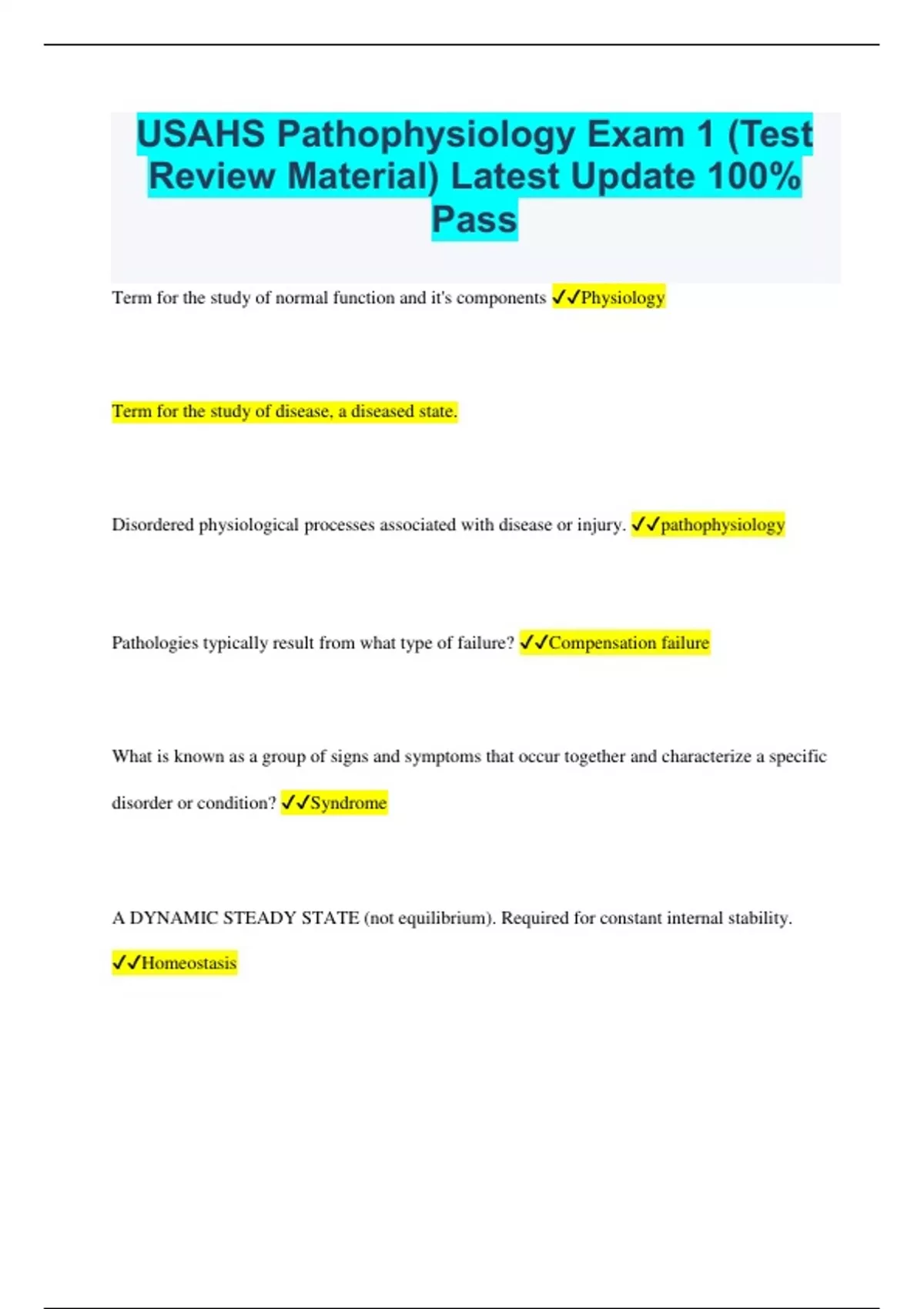 USAHS Pathophysiology Exam 1 (Test Review Material) Latest Update 100% Pass Term for the study of normal function and it's components Physiology Term for the study of disease, a diseased state. Disordered physiological processes associated with disease or injury. pathophysiology Pathologies typically result from what type of failure? Compensation failure What is known as a group of signs and symptoms that occur together and characterize a specific disorder or condition? Syndrome A DYNAMIC STEADY STATE (not equilibrium). Required for constant internal stability. Homeostasis Describes the origin and development of the disease, and whether it is acute, chronic, or recurrent. Pathogenesis Successful compensation to internal or external changes, if not compensated = disease Some ways the body maintains homeostasis: To maintain hemostasis the body monitors BP, glucose, minerals etc.. BP, glucose, minerals etc.. theological approach is the ? key words? the WHY does it happen; "Because or To" Mechanistic Approach is the? the HOW does it happen Example of how Shape follows Function: RBC = normal biconcave if sickle = anemia Intracellular components/functions: Who Does/Contains the Following? - DNA Nucleus - DNA Intracellular components/functions: Who Does/Contains the Following? - ATP Mitochondria - ATP Intracellular components/functions: Who Does/Contains the Following? - calcium storage Smooth ER - calcium storage Intracellular components/functions: Who Does/Contains the Following? -