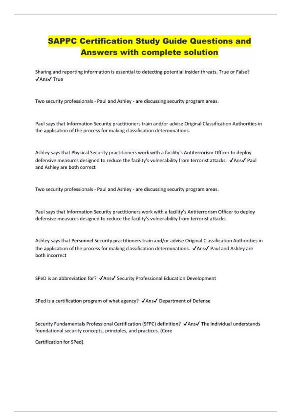 Sharing and reporting information is essential to detecting potential insider threats. True or False? True Two security professionals - Paul and Ashley - are discussing security program areas. Paul says that Information Security practitioners train and/or advise Original Classification Authorities in the application of the process for making classification determinations. Ashley says that Physical Security practitioners work with a facility's Antiterrorism Officer to deploy defensive measures designed to reduce the facility's vulnerability from terrorist attacks. Paul and Ashley are both correct Two security professionals - Paul and Ashley - are discussing security program areas. Paul says that Information Security practitioners work with a facility's Antiterrorism Officer to deploy defensive measures designed to reduce the facility's vulnerability from terrorist attacks. Ashley says that Personnel Security practitioners train and/or advise Original Classification Authorities in the application of the process for making classification determinations. Paul and Ashley are both incorrect SPeD is an abbreviation for? Security Professional Education Development SPed is a certification program of what agency? Department of Defense Security Fundamentals Professional Certification (SFPC) definition? The individual understands foundational security concepts, principles, and practices. (Core Certification for SPed). Security Asset Protection Professional Certification (SAPPC) definition? The Individual applies foundational security concepts, principles, and practices. (Core Certification for SPed). Security Program Integration Professional Certification (SPIPC) definition? The individual understands and applies risk assessment and security program management based on security concepts, principles, and practices. (Core Certification for SPed). Security Enterprise Professional Certification (SEPC) definition? The individual understands and applies concepts, principles, and practices for managing enterprise-wide security. What are the three principle incident/events required to be reported to DoD Counterintelligence (CI) organizations? Espionage, Sabotage, Terrorism & Cyber Policy PMO is an abbreviation for? Program Management Office Provides the legal requirements to use lawful means to ensure U. S. receives the best intelligence available? E.O. 12333 The manual that includes CI-related requirements for Industry? DoD 5220.22-M (NISPOM) Regulation mandating CI-specific training, briefing, and reporting? DoDI5240.6: CI Awareness, Briefing, and Reporting Programs Regulation providing procedures to follow when classified information is compromised? DoD 5200.1-R: information Security Program What are three principle incidents/events required to report to DoD counterintelligence (CI) organizations? Espionage, Sabotage, Terrorism & Cyber Policy List three different types of threats to classified information? Insider Threat, Foreign Intelligence Entities (FIE), Cybersecurity Threat List three indicators of insider threats? Failure to report overseas travel or contact with foreign nationals. Seeking to gain higher clearance or expand access outside the job scope. Engaging in classified conversations without a need to know. Working hours inconsistent with job assignment or insistence on working in private. Exploitable behavior traits. Repeated security violations. Attempting to enter areas not granted access to. List three elements that should be considered in identifying Critical Program Information? - Cause significant degradation in mission effectiveness - Shorten the expected combat-effective life of the system - Reduce technological advantage - Significantly alter program direction - Enable an adversary to defeat, counter, copy, or reverse-engineer the technology or capability. Briefly describe the concept of insider threat? An employee who may represent a threat to national security. These threats encompass potential espionage, violent acts against the Government or the nation, and unauthorized disclosure of classified information, including the vast amounts of classified data available on interconnected United States Government computer networks and systems. List three elements that a security professional should consider when assessing and managing risks to DoD assets? Asset Threat Vulnerability Risk Countermeasures Describe the purpose of the Foreign Visitor Program? To track and approve access by a foreign entity to information that is classified; and to approve access by a foreign entity to information that is unclassified, related to a U.S. Government contract, or plant visits covered by ITAR. Briefly define a Special Access Program (SAP)? A program established for a specific class of classified information that imposes safeguarding and access requirements that exceed those normally required for information at the same classification level. List three enhanced security requirements for protecting Special Access Program (SAP) Information within Personnel Security? Access Rosters Billet Structures (if required) Indoctrination Agreement Clearance based on an appropriate investigation completed within the last 5 years Individual must materially contribute to the program in addition to having the need to know All individuals with access to SAP are subject to a random counterintelligence-scope polygraph Identify the four Cognizant Security Agencies (CSA)? Department of Defense (DoD) Director of National Intelligence (DNI) Department of Energy (DoE) Nuclear Regulatory Commission (NRC).