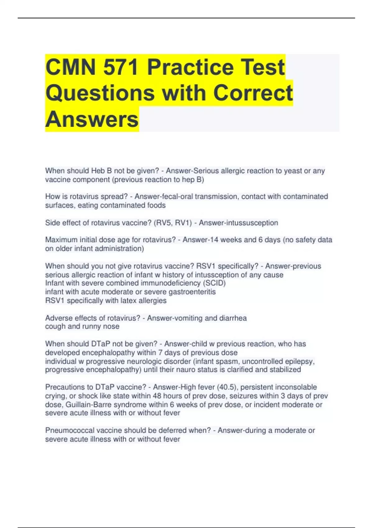 CMN 571 Practice Test Questions with Correct Answers When should Heb B not be given? - Answer-Serious allergic reaction to yeast or any vaccine component (previous reaction to hep B) How is rotavirus spread? - Answer-fecal-oral transmission, contact with contaminated surfaces, eating contaminated foods Side effect of rotavirus vaccine? (RV5, RV1) - Answer-intussusception Maximum initial dose age for rotavirus? - Answer-14 weeks and 6 days (no safety data on older infant administration) When should you not give rotavirus vaccine? RSV1 specifically? - Answer-previous serious allergic reaction of infant w history of intussception of any cause Infant with severe combined immunodeficiency (SCID) infant with acute moderate or severe gastroenteritis RSV1 specifically with latex allergies Adverse effects of rotavirus? - Answer-vomiting and diarrhea cough and runny nose When should DTaP not be given? - Answer-child w previous reaction, who has developed encephalopathy within 7 days of previous dose individual w progressive neurologic disorder (infant spasm, uncontrolled epilepsy, progressive encephalopathy) until their nauro status is clarified and stabilized Precautions to DTaP vaccine? - Answer-High fever (40.5), persistent inconsolable crying, or shock like state within 48 hours of prev dose, seizures within 3 days of prev dose, Guillain-Barre syndrome within 6 weeks of prev dose, or incident moderate or severe acute illness with or without fever Pneumococcal vaccine should be deferred when? - Answer-during a moderate or severe acute illness with or without fever Adverse effects of Pneumococcal vaccine - Answer-small risk of febrile seizure if administered with inactivated influenza vaccine IPV vaccine - Answer-Poliomyelitis vaccine Contraindications to adminsitering IPV vaccine? - Answer-moderate or severe acute illness with or without fever pregnancy Can you give IPV vaccine during pregnancy? - Answer-Do with precaution MMR Vaccine can cause what reaction? - Answer-Febrile seizures MMR Vaccine should not be given to who? - Answer-Pregnant women What age does a child crawl? - Answer-6-8 months What age does child run? - Answer-18 months What age should the child be able to walk backwards? - Answer-30 months (2.5 years) What age should be using pronouns? - Answer-24 months When should child be holding crayon with fist? - Answer-30 months (2.5 years) When should child be holding crayon with fingers? - Answer-3 years Can a 4-5-year-old tie shoes? - Answer-No, only laces shoes What age copies a circle? - Answer-3 years What age copies a cross? - Answer-4 years What age copies a triangle? - Answer-5 years What age draws vertical lines? - Answer-2 years What age can scribble? - Answer-18 months What are will imitate scribbling? - Answer-15 months What age uses tricycle? - Answer-3 years Which age alternates feet up the stairs? - Answer-4 years What age kicks a ball? - Answer-2 years What age throws a ball? - Answer-18 months Which age does parallel play? - Answer-2 years What age does cooperative play? - Answer-4 years What age reaches with 1 hand? - Answer-6-8 months What age reaches with both hands and puts object in mouth? - Answer-3-5 months What age has 4 words phrases? - Answer-4 years What age says you me and I and makes 3 cube bridge? - Answer-3 years What age jumps with 2 feet? - Answer-2 years What age has vocal of 4-20 words? - Answer-18 months What age has 1-2-word vocabulary? - Answer-12 months What age coos? - Answer-3-5 months What age babbles? - Answer-6-8 months What age draws a circle for a person? - Answer-4 years What age draws a person with appendages eyes and no torso? - Answer-4-5 years What age follows 1 step commands? - Answer-9 months What age follows 2 step commands? - Answer-18 months What ages do you conduct anemia and lead blood test? - Answer-12 months and 2 years