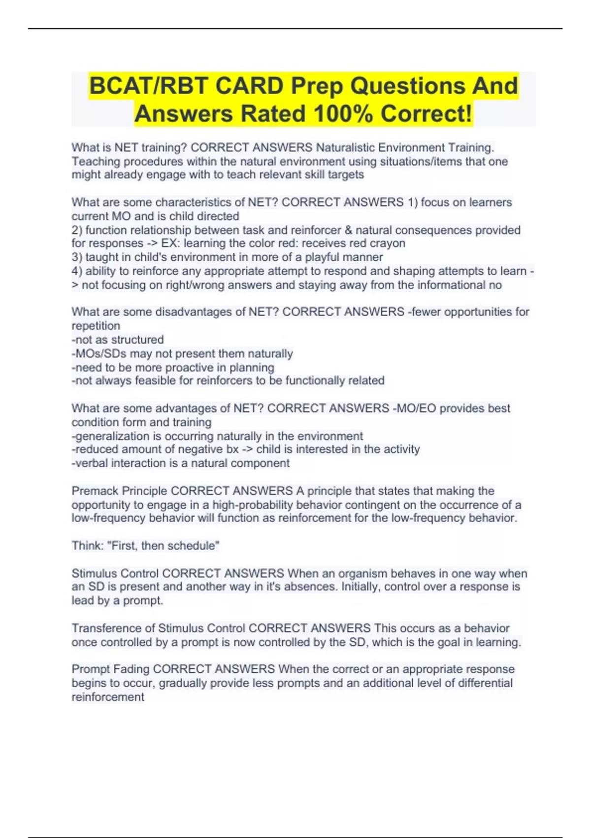 BCAT/RBT CARD Prep Questions And Answers Rated 100% Correct!