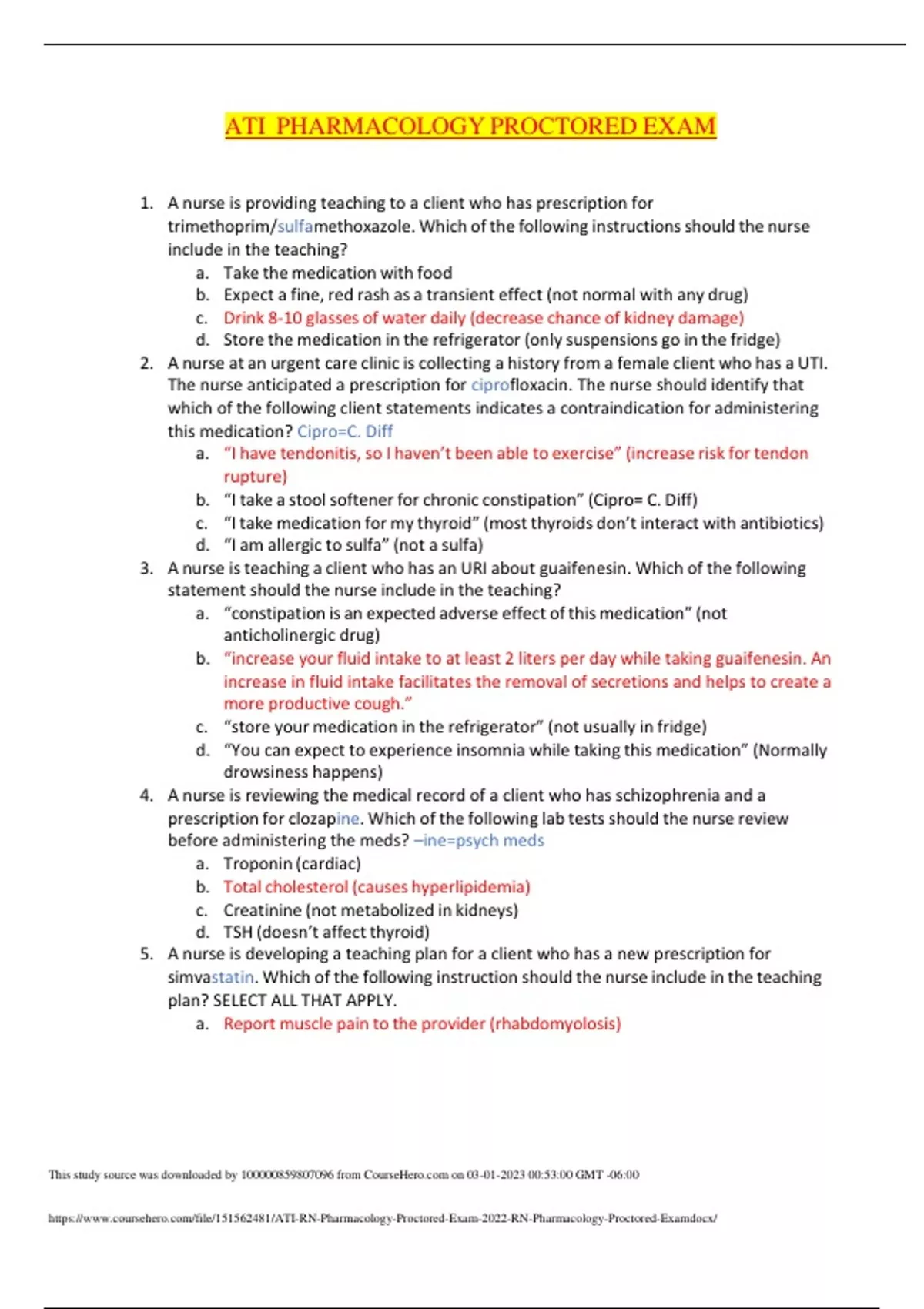ATI PHARMACOLOGY PROCTORED EXAM 1. A nurse is providing teaching to a client who has prescription for trimethoprim/sulfamethoxazole. Which of the following instructionsshould the nurse include in the teaching? a. Take the medication with food b. Expect a fine, red rash as a transient effect (not normal with any drug) c. Drink 8-10 glasses of water daily (decrease chance of kidney damage) d. Store the medication in the refrigerator (only suspensions go in the fridge) 2. A nurse at an urgent care clinic is collecting a history from a female client who has a UTI. The nurse anticipated a prescription for ciprofloxacin. The nurse should identify that which of the following client statements indicates a contraindication for administering this medication? Cipro=C. Diff a. “I have tendonitis, so I haven’t been able to exercise” (increase risk for tendo
