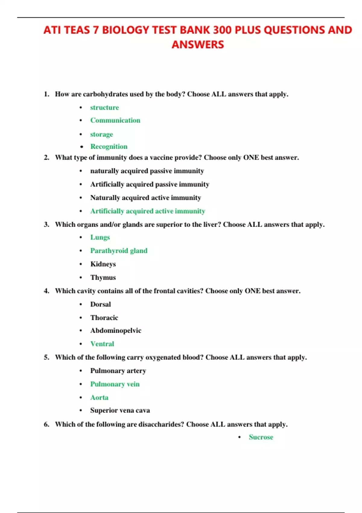 ATI TEAS 7 BIOLOGY TEST BANK 300 PLUS QUESTIONS AND ANSWERS 2023 With Updated 100% Correct Answers 1. How are carbohydrates used by the body? Choose ALL answers that apply. • structure • Communication • storage • Recognition 2. What type of immunity does a vaccine provide? Choose only ONE best answer. • naturally acquired passive immunity • Artificially acquired passive immunity • Naturally acquired active immunity • Artificially acquired active immunity 3. Which organs and/or glands are superior to the liver? Choose ALL answers that apply. • Lungs • Parathyroid gland • Kidneys • Thymus 4. Which cavity contains all of the frontal cavities? C