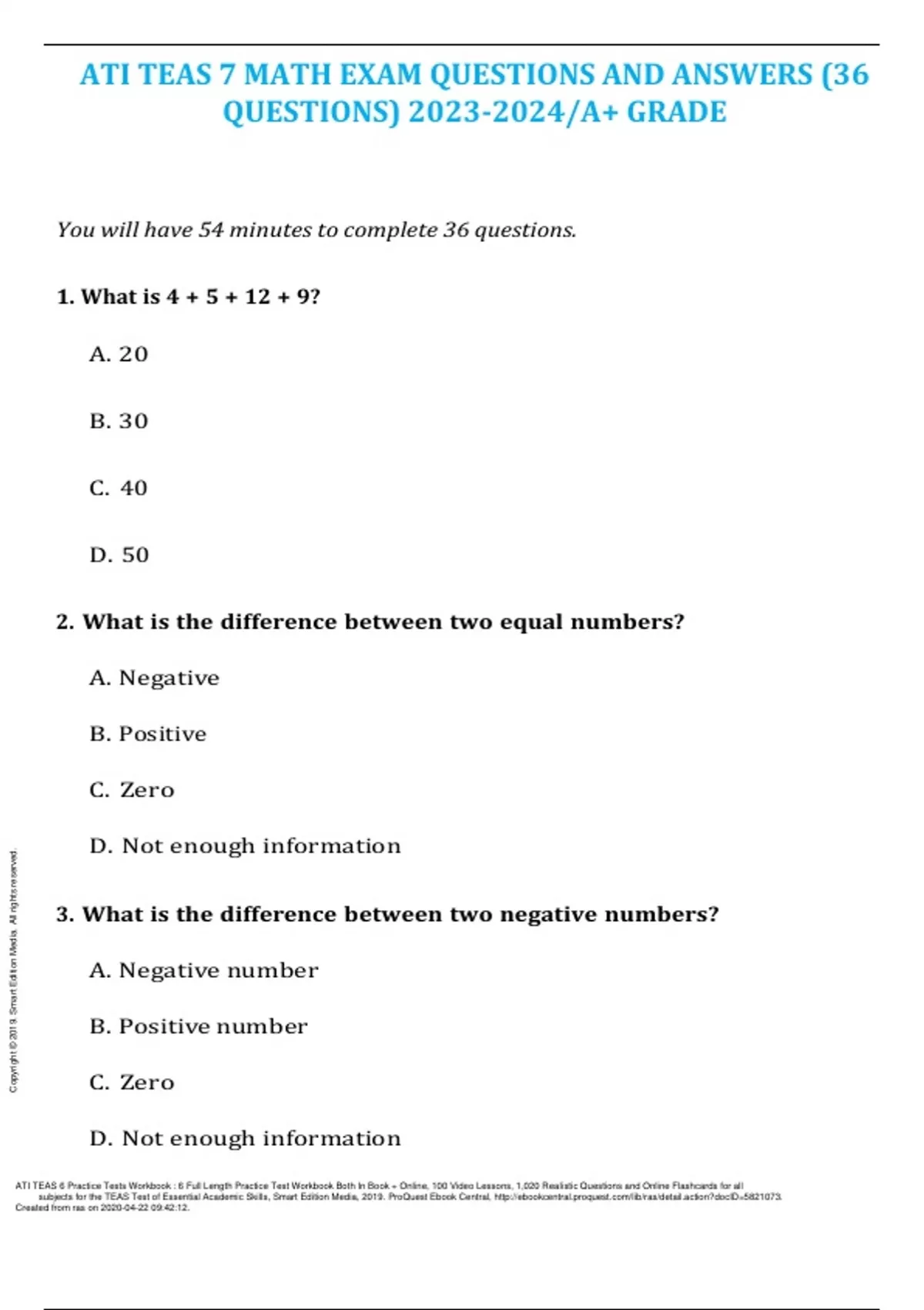 ATI TEAS 7 MATH EXAM QUESTIONS AND ANSWERS (36 QUESTIONS) /A+ GRADE You will have 54 minutes to complete 36 questions. 1. What is 4 + 5 + 12 + 9? A. 20 B. 30 C. 40 D. 50 2. What is the difference between two equal numbers