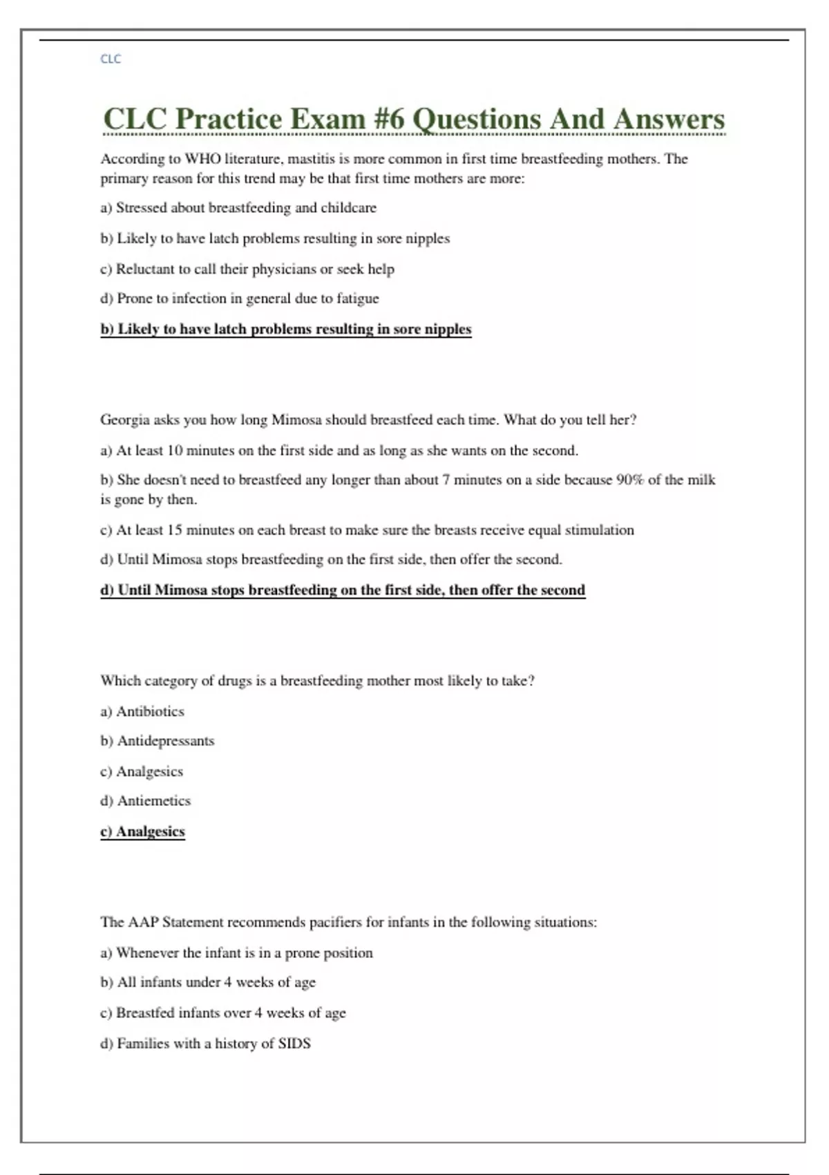 CLC Practice Exam #6 Questions And Answers According to WHO literature, mastitis is more common in first time breastfeeding mothers. The primary reason for this trend may be that first time mothers are more: a) Stressed about breastfeeding and childcare b) Likely to have latch problems resulting in sore nipples c) Reluctant to call their physicians or seek help d) Prone to infection in general due to fatigue b) Likely to have latch problems resulting in sore nipples Georgia asks you how long Mimosa should breastfeed each time. What do you tell her? a) At least 10 minutes on the first side and as long as she wants on the second. b) She doesn't need to breastfeed any longer than about 7 minutes on a side because 90% of the milk is gone by then. c) At least 15 minutes on each breast to make sure the breasts receive equal stimulation d) Until Mimosa stops breastfeeding on the first side, then offer the second. d) Until Mimosa stops breastfeeding on the first side, then offer the second Which category of drugs is a breastfeeding mother most likely to take? a) Antibiotics b) Antidepressants c) Analgesics d) Antiemetics c) Analgesics The AAP Statement recommends pacifiers for infants in the following situations: a) Whenever the infant is in a prone position b) All infants under 4 weeks of age c) Breastfed infants over 4 weeks of age d) Families with a history of SIDS c) Breastfed infants over 4 weeks of age Which of the following nutritional advice for breastfeeding women is evidence-based? a) Increase caloric intake by 500 calories per day b) Drink enough fluids to satisfy thirst c) Avoid spicy foods as they will affect the baby's digestion d) Drink at least 2, 8 oz. glasses of milk per day b) Drink enough fluids to satisfy thirst The birth spacing effects of breastfeeding are most beneficial for: a) Infant well-being b) Lactational amenorrhea c) Maternal recovery from childbirth d) Increasing ovulation c) Maternal recovery from childbirth