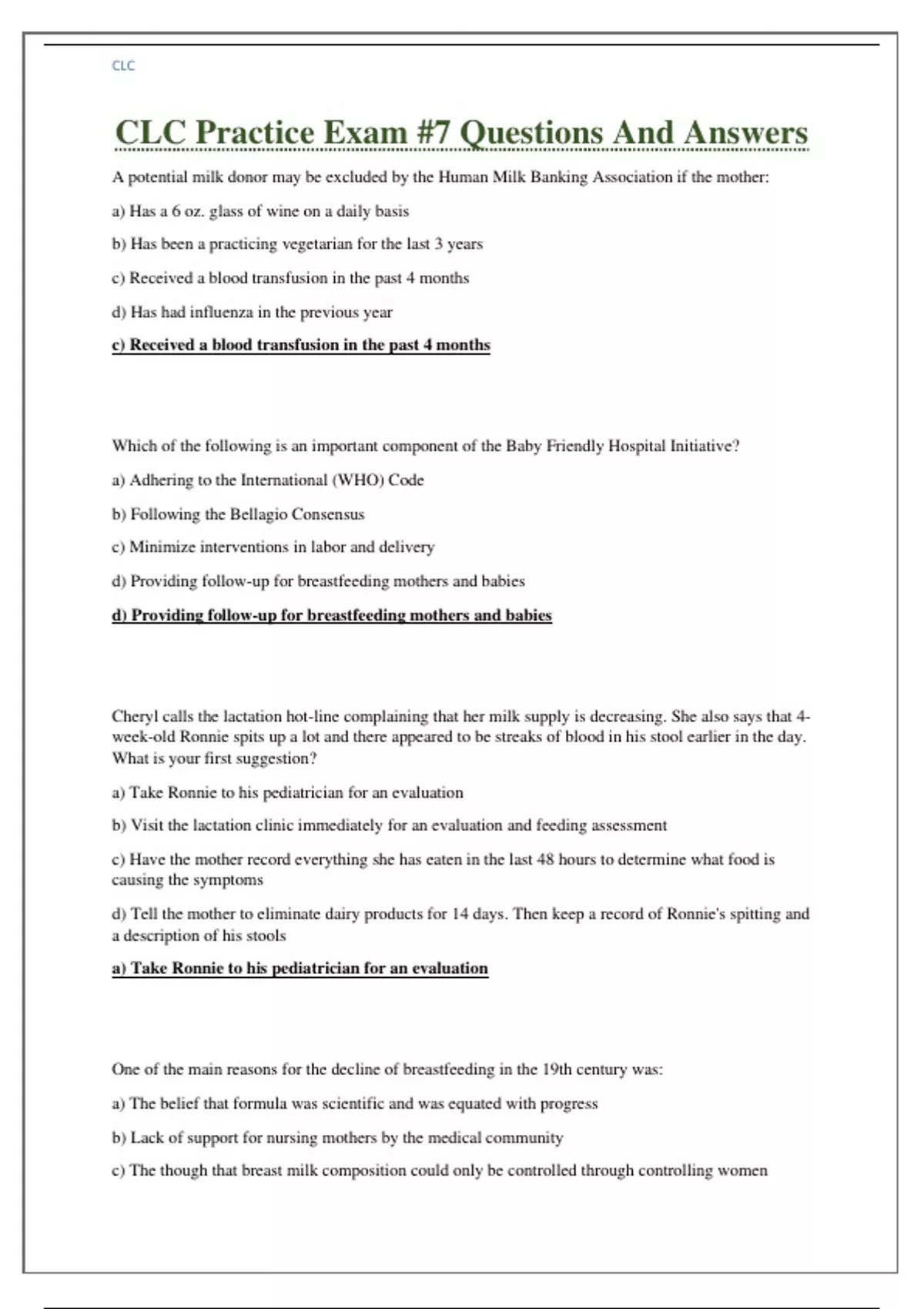 CLC Practice Exam #7 Questions And Answers A potential milk donor may be excluded by the Human Milk Banking Association if the mother: a) Has a 6 oz. glass of wine on a daily basis b) Has been a practicing vegetarian for the last 3 years c) Received a blood transfusion in the past 4 months d) Has had influenza in the previous year c) Received a blood transfusion in the past 4 months Which of the following is an important component of the Baby Friendly Hospital Initiative? a) Adhering to the International (WHO) Code b) Following the Bellagio Consensus c) Minimize interventions in labor and delivery d) Providing follow-up for breastfeeding mothers and babies d) Providing follow-up for breastfeeding mothers and babies Cheryl calls the lactation hot-line complaining that her milk supply is decreasing. She also says that 4-week-old Ronnie spits up a lot and there appeared to be streaks of blood in his stool earlier in the day. What is your first suggestion? a) Take Ronnie to his pediatrician for an evaluation b) Visit the lactation clinic immediately for an evaluation and feeding assessment c) Have the mother record everything she has eaten in the last 48 hours to determine what food is causing the symptoms d) Tell the mother to eliminate dairy products for 14 days. Then keep a record of Ronnie's spitting and a description of his stools a) Take Ronnie to his pediatrician for an evaluation
