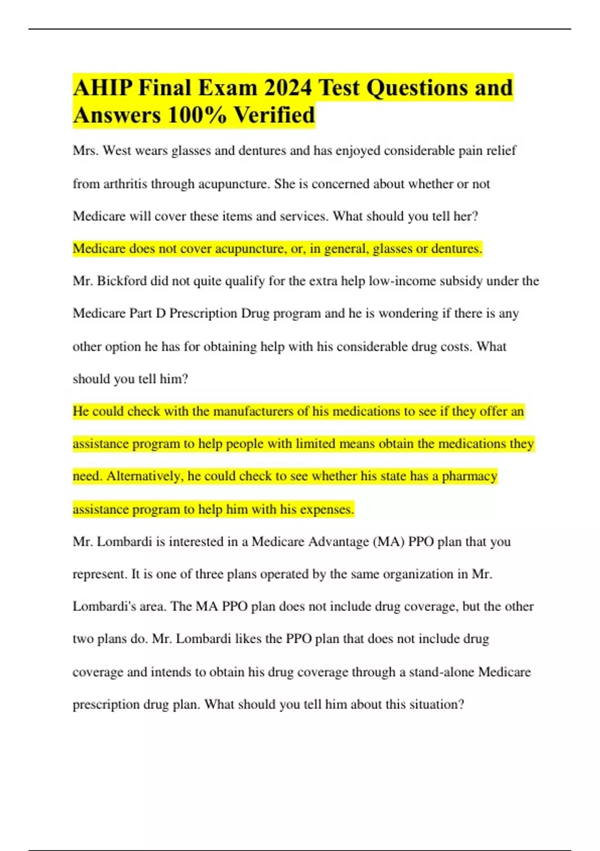 AHIP Final Exam 2024 Test Questions and Answers 100% Verified