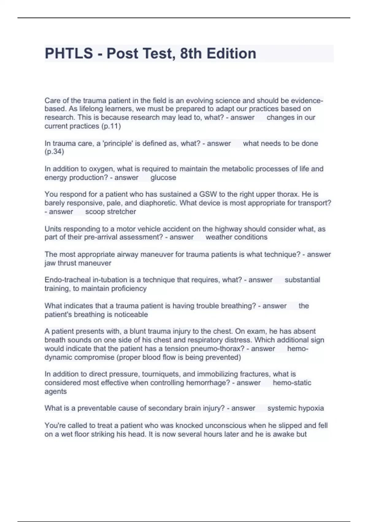 PHTLS - Post Test, 8th Edition Questions and Answers 2024