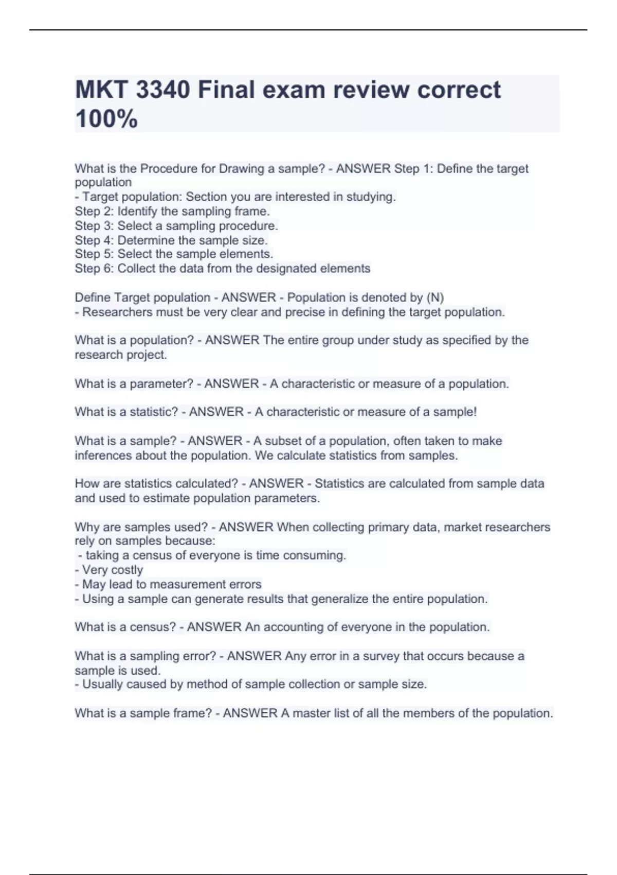 MKT 3340 Final exam review correct 100% What is the Procedure for Drawing a sample? - ANSWER Step 1: Define the target population - Target population: Section you are interested in studying. Step 2: Identify the sampling frame. Step 3: Select a sampling procedure. Step 4: Determine the sample size. Step 5: Select the sample elements. Step 6: Collect the data from the designated elements Define Target population - ANSWER - Population is denoted by (N) - Researchers must be very clear and precise in defining the target population. What is a population? - ANSWER The entire group under study as specified by the research project. What is a parameter? - ANSWER - A characteristic or measure of a population. What is a statistic? - ANSWER - A characteristic or measure of a sample! What is a sample? - ANSWER - A subset of a population, often taken to make inferences about the population. We calculate statistics from samples. How are statistics calculated? - ANSWER - Statistics are calculated from sample data and used to estimate population parameters. Why are samples used? - ANSWER When collecting primary data, market researchers rely on samples because: - taking a census of everyone is time consuming. - Very costly - May lead to measurement errors - Using a sample can generate results that generalize the entire population. What is a census? - ANSWER An accounting of everyone in the population. What is a sampling error? - ANSWER Any error in a survey that occurs because a