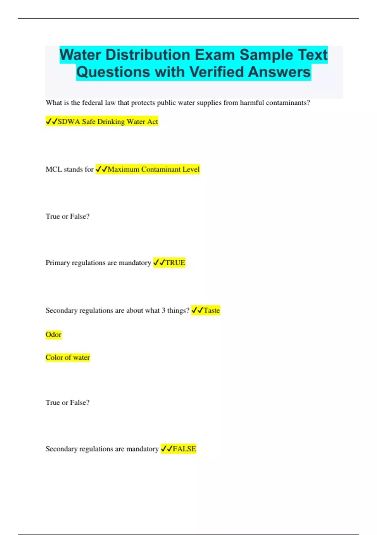 What is the federal law that protects public water supplies from harmful contaminants? SDWA Safe Drinking Water Act MCL stands for Maximum Contaminant Level True or False? Primary regulations are mandatory TRUE Secondary regulations are about what 3 things? Taste Odor Color of water True or False? Secondary regulations are mandatory FALSE
