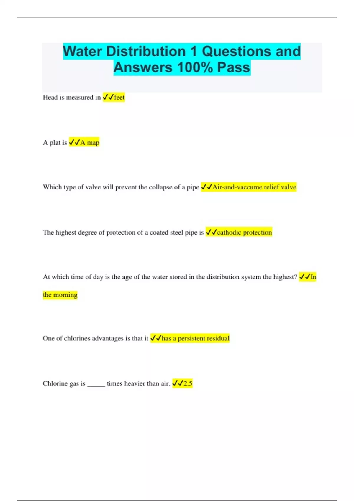 Head is measured in feet A plat is A map Which type of valve will prevent the collapse of a pipe Air-and-vaccume relief valve The highest degree of protection of a coated steel pipe is cathodic protection At which time of day is the age of the water stored in the distribution system the highest? In the morning One of chlorines advantages is that it has a persistent residual Chlorine gas is _____ times heavier than air. 2.5