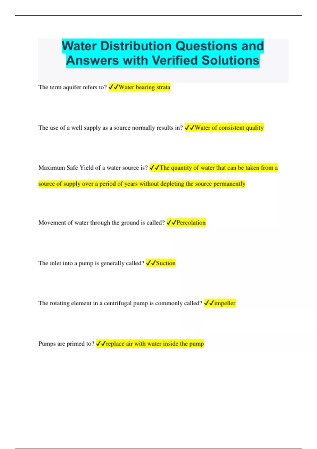 The term aquifer refers to? Water bearing strata The use of a well supply as a source normally results in? Water of consistent quality Maximum Safe Yield of a water source is? The quantity of water that can be taken from a source of supply over a period of years without depleting the source permanently Movement of water through the ground is called? Percolation The inlet into a pump is generally called? Suction The rotating element in a centrifugal pump is commonly called? impeller Pumps are primed to? replace air with water inside the pump