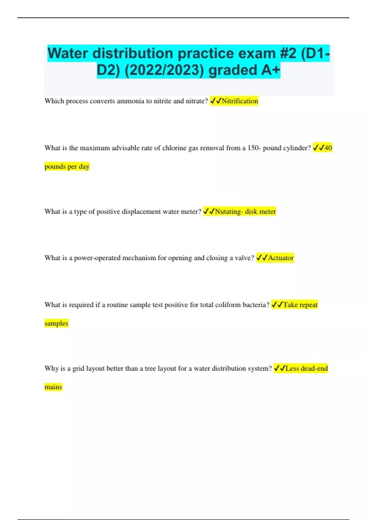 Which process converts ammonia to nitrite and nitrate? Nitrification What is the maximum advisable rate of chlorine gas removal from a 150- pound cylinder? 40 pounds per day What is a type of positive displacement water meter? Nutating- disk meter What is a power-operated mechanism for opening and closing a valve? Actuator What is required if a routine sample test positive for total coliform bacteria? Take repeat samples Why is a grid layout better than a tree layout for a water distribution system? Less dead-end mains
