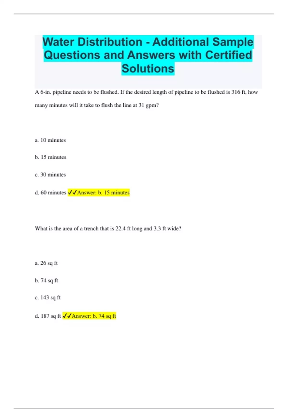 A 6-in. pipeline needs to be flushed. If the desired length of pipeline to be flushed is 316 ft, how many minutes will it take to flush the line at 31 gpm? a. 10 minutes b. 15 minutes c. 30 minutes d. 60 minutes Answer: b. 15 minutes What is the area of a trench that is 22.4 ft long and 3.3 ft wide? a. 26 sq ft b. 74 sq ft c. 143 sq ft d. 187 sq ft Answer: b. 74 sq f