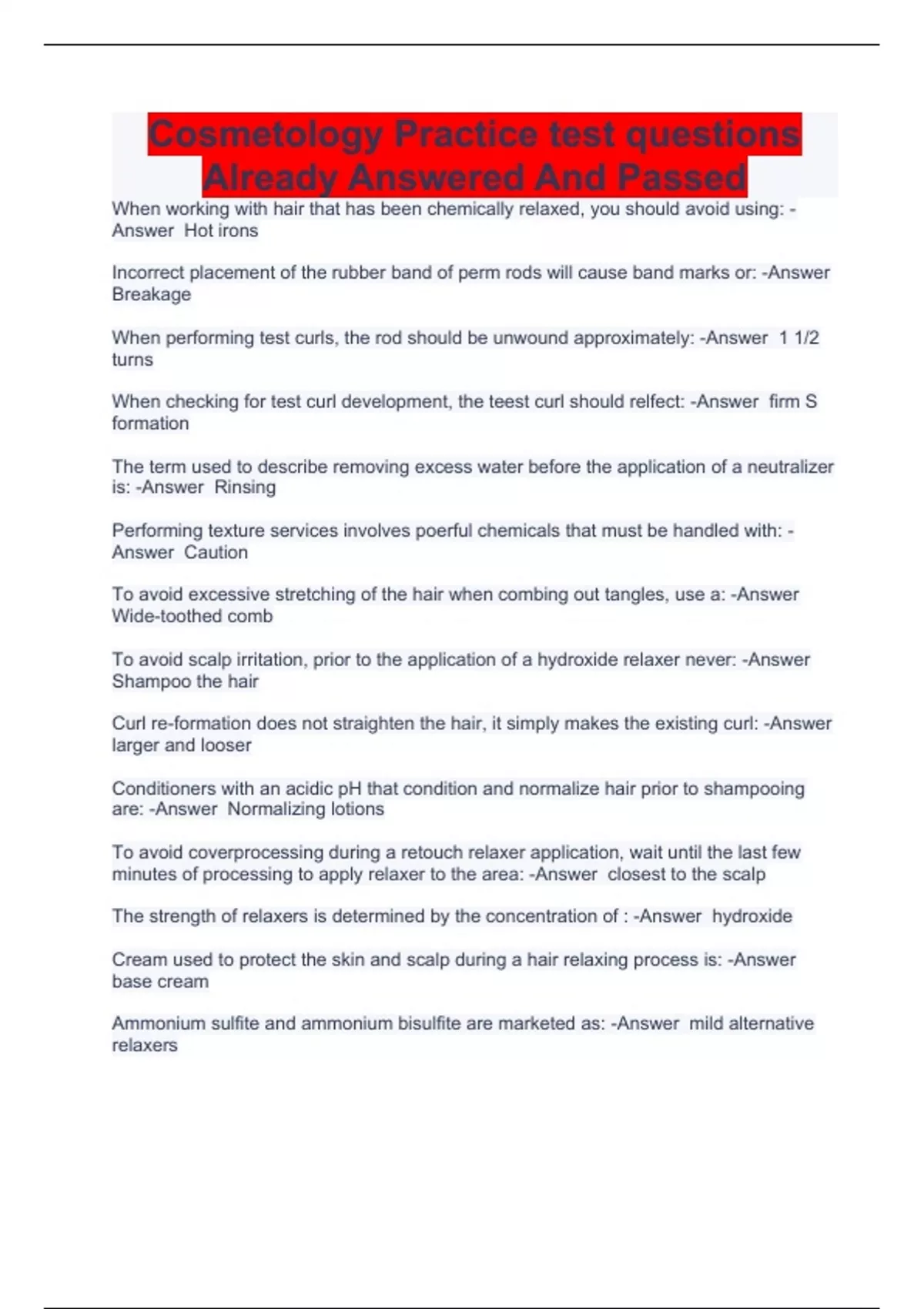 When working with hair that has been chemically relaxed, you should avoid using: -Answer Hot irons Incorrect placement of the rubber band of perm rods will cause band marks or: -Answer Breakage When performing test curls, the rod should be unwound approximately: -Answer 1 1/2 turns When checking for test curl development, the teest curl should relfect: -Answer firm S formation The term used to describe removing excess water before the application of a neutralizer is: -Answer Rinsing Performing texture services involves poerful chemicals that must be handled with: -Answer Caution To avoid excessive stretching of the hair when combing out tangles, use a: -Answer Wide-toothed comb To avoid scalp irritation, prior to the application of a hydroxide relaxer never: -Answer Shampoo the hair Curl re-formation does not straighten the hair, it simply makes the existing curl: -Answer larger and looser Conditioners with an acidic pH that condition and normalize hair prior to shampooing are: -Answer Normalizing lotions To avoid coverprocessing during a retouch relaxer application, wait until the last few minutes of processing to apply relaxer to the area: -Answer closest to the scalp The strength of relaxers is determined by the concentration of : -Answer hydroxide Cream used to protect the skin and scalp during a hair relaxing process is: -Answer base cream Ammonium sulfite and ammonium bisulfite are marketed as: -Answer mild alternative relaxers