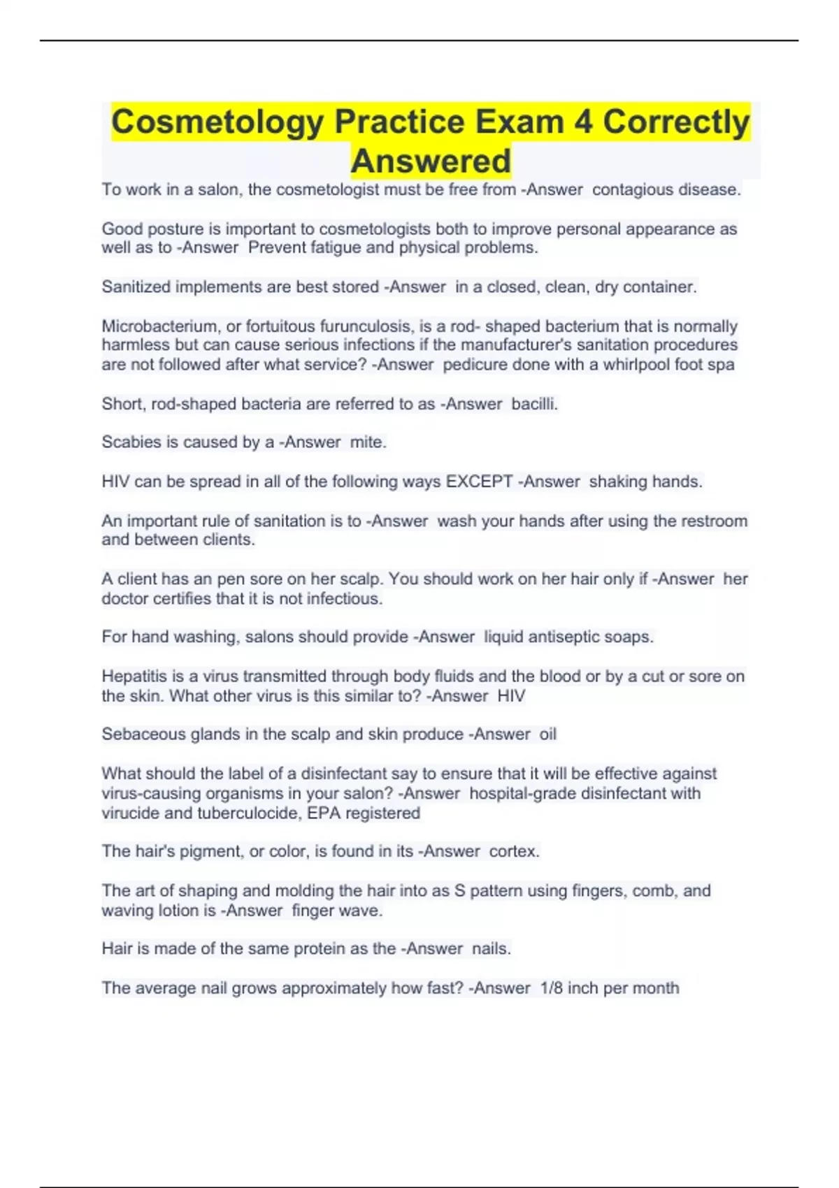 To work in a salon, the cosmetologist must be free from -Answer contagious disease. Good posture is important to cosmetologists both to improve personal appearance as well as to -Answer Prevent fatigue and physical problems. Sanitized implements are best stored -Answer in a closed, clean, dry container. Microbacterium, or fortuitous furunculosis, is a rod- shaped bacterium that is normally harmless but can cause serious infections if the manufacturer's sanitation procedures are not followed after what service? -Answer pedicure done with a whirlpool foot spa Short, rod-shaped bacteria are referred to as -Answer bacilli. Scabies is caused by a -Answer mite. HIV can be spread in all of the following ways EXCEPT -Answer shaking hands. An important rule of sanitation is to -Answer wash your hands after using the restroom and between clients. A client has an pen sore on her scalp. You should work on her hair only if -Answer her doctor certifies that it is not infectious. For hand washing, salons should provide -Answer liquid antiseptic soaps. Hepatitis is a virus transmitted through body fluids and the blood or by a cut or sore on the skin. What other virus is this similar to? -Answer HIV Sebaceous glands in the scalp and skin produce -Answer oil What should the label of a disinfectant say to ensure that it will be effective against virus-causing organisms in your salon? -Answer hospital-grade disinfectant with virucide and tuberculocide, EPA registered The hair's pigment, or color, is found in its -Answer cortex. The art of shaping and molding the hair into as S pattern using fingers, comb, and waving lotion is -Answer finger wave. Hair is made of the same protein as the -Answer nails. The average nail grows approximately how fast? -Answer 1/8 inch per month