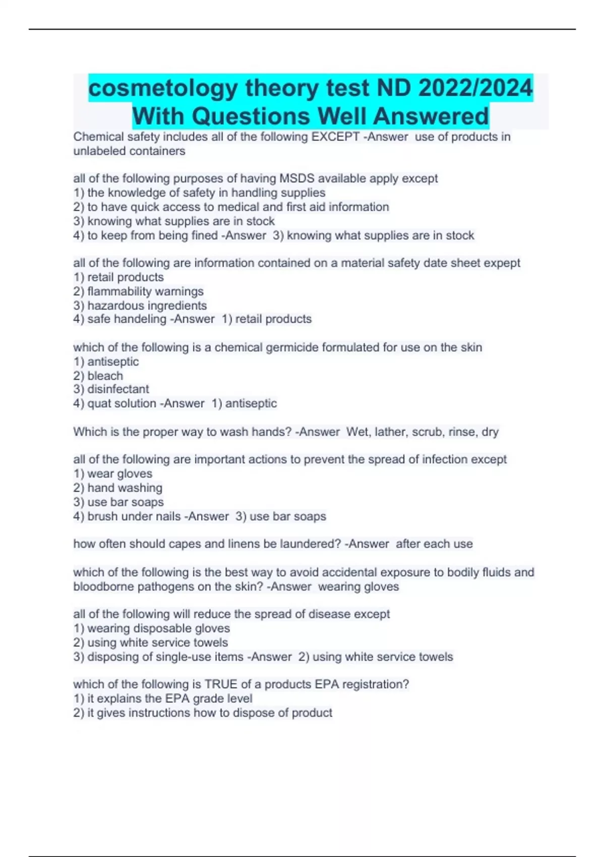 Chemical safety includes all of the following EXCEPT -Answer use of products in unlabeled containers all of the following purposes of having MSDS available apply except 1) the knowledge of safety in handling supplies 2) to have quick access to medical and first aid information 3) knowing what supplies are in stock 4) to keep from being fined -Answer 3) knowing what supplies are in stock all of the following are information contained on a material safety date sheet expept 1) retail products 2) flammability warnings 3) hazardous ingredients 4) safe handeling -Answer 1) retail products which of the following is a chemical germicide formulated for use on the skin 1) antiseptic 2) bleach 3) disinfectant 4) quat solution -Answer 1) antiseptic Which is the proper way to wash hands? -Answer Wet, lather, scrub, rinse, dry all of the following are important actions to prevent the spread of infection except 1) wear gloves 2) hand washing 3) use bar soaps 4) brush under nails -Answer 3) use bar soaps how often should capes and linens be laundered? -Answer after each use which of the following is the best way to avoid accidental exposure to bodily fluids and bloodborne pathogens on the skin? -Answer wearing gloves all of the following will reduce the spread of disease except 1) wearing disposable gloves 2) using white service towels 3) disposing of single-use items -Answer 2) using white service towels which of the following is TRUE of a products EPA registration? 1) it explains the EPA grade level 2) it gives instructions how to dispose of produ