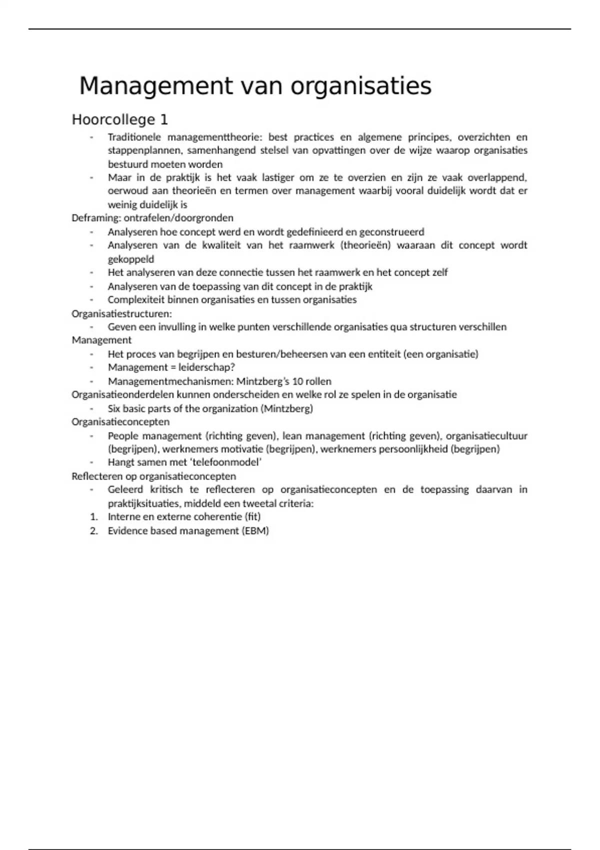 Samenvatting van alle hoorcolleges van Management van Organisaties van de Minor Bestuurs en Organisatiewetenschappen op de UU Met de hoorcolleges leren (zonder literatuur) kom je een heel eind, ik heb er zelf een 8 mee gehaald!