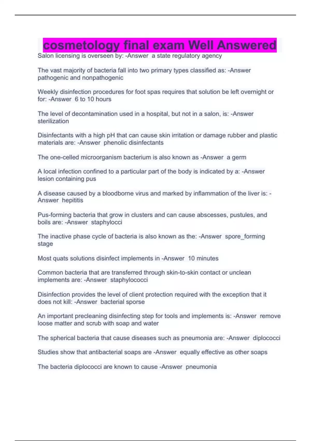 Salon licensing is overseen by: -Answer a state regulatory agency The vast majority of bacteria fall into two primary types classified as: -Answer pathogenic and nonpathogenic Weekly disinfection procedures for foot spas requires that solution be left overnight or for: -Answer 6 to 10 hours The level of decontamination used in a hospital, but not in a salon, is: -Answer sterilization Disinfectants with a high pH that can cause skin irritation or damage rubber and plastic materials are: -Answer phenolic disinfectants The one-celled microorganism bacterium is also known as -Answer a germ A local infection confined to a particular part of the body is indicated by a: -Answer lesion containing pus A disease caused by a bloodborne virus and marked by inflammation of the liver is: -Answer hepititis Pus-forming bacteria that grow in clusters and can cause abscesses, pustules, and boils are: -Answer staphylocci The inactive phase cycle of bacteria is also known as the: -Answer spore_forming stage Most quats solutions disinfect implements in -Answer 10 minutes Common bacteria that are transferred through skin-to-skin contact or unclean implements are: -Answer staphylococci Disinfection provides the level of client protection required with the exception that it does not kill: -Answer bacterial sporse An important precleaning disinfecting step for tools and implements is: -Answer remove loose matter and scrub with soap and water The spherical bacteria that cause diseases such as pneumonia are: -Answer diplococci Studies show that antibacterial soaps are -Answer equally effective as other soaps The bacteria diplococci are known to cause -Answer pneumonia