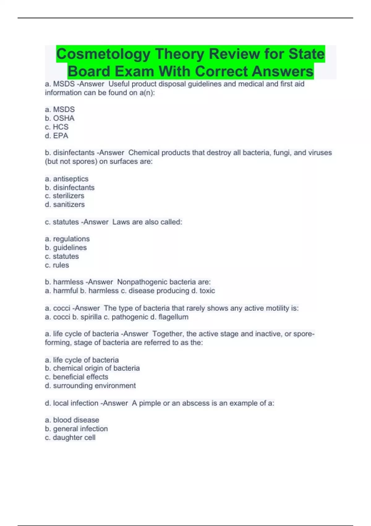 a. MSDS -Answer Useful product disposal guidelines and medical and first aid information can be found on a(n): a. MSDS b. OSHA c. HCS d. EPA b. disinfectants -Answer Chemical products that destroy all bacteria, fungi, and viruses (but not spores) on surfaces are: a. antiseptics b. disinfectants c. sterilizers d. sanitizers c. statutes -Answer Laws are also called: a. regulations b. guidelines c. statutes c. rules b. harmless -Answer Nonpathogenic bacteria are: a. harmful b. harmless c. disease producing d. toxic a. cocci -Answer The type of bacteria that rarely shows any active motility is: a. cocci b. spirilla c. pathogenic d. flagellum a. life cycle of bacteria -Answer Together, the active stage and inactive, or spore-forming, stage of bacteria are referred to as the: a. life cycle of bacteria b. chemical origin of bacteria c. beneficial effects d. surrounding environment d. local infection -Answer A pimple or an abscess is an example of a: a. blood disease b. general infection c. daughter cell d. local infection