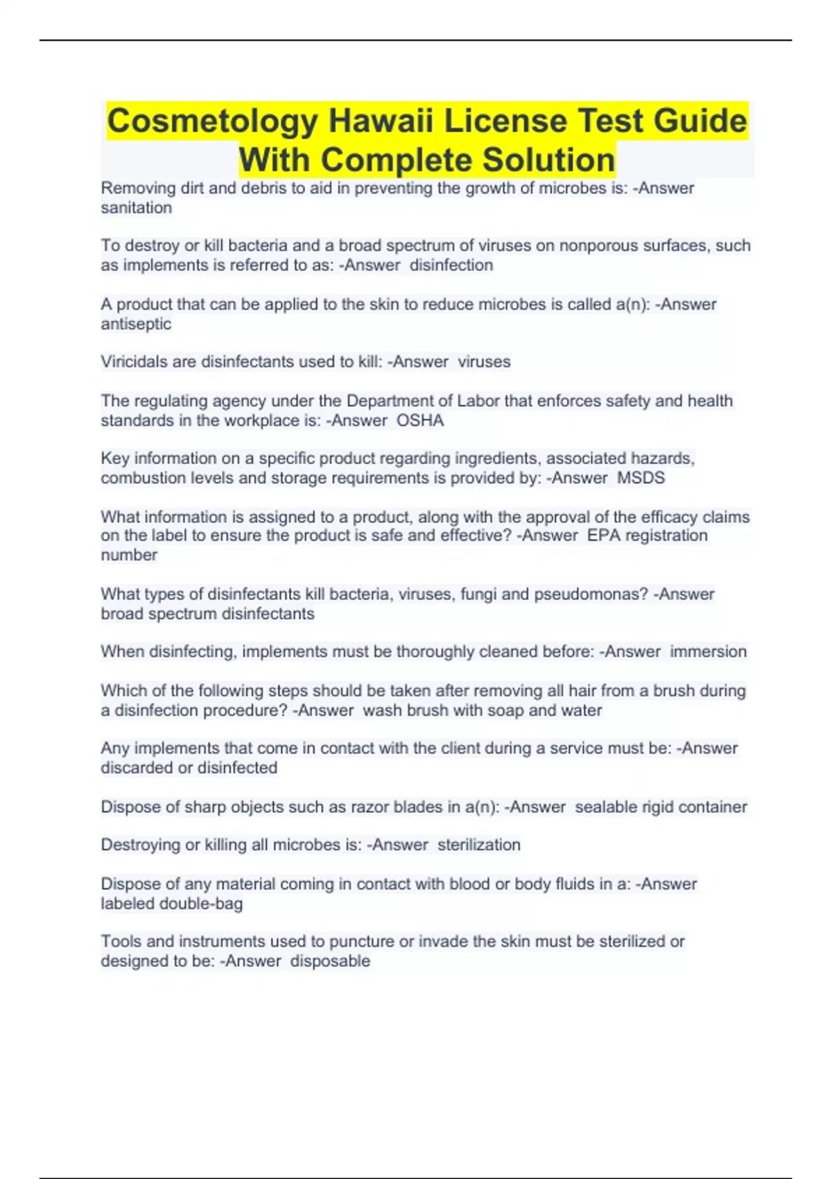Cosmetology Hawaii License Test Guide With Complete Solution
