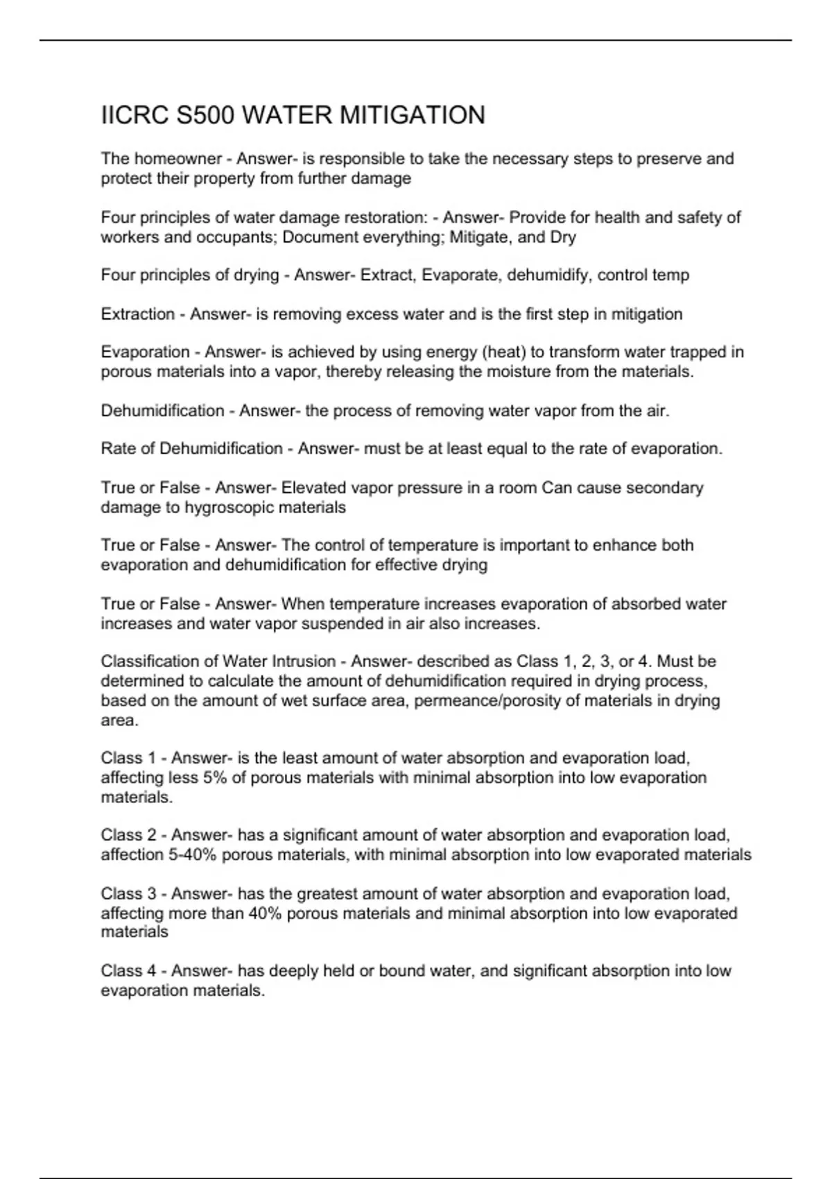 The homeowner - Answer- is responsible to take the necessary steps to preserve and protect their property from further damage Four principles of water damage restoration: - Answer- Provide for health and safety of workers and occupants; Document everything; Mitigate, and Dry Four principles of drying - Answer- Extract, Evaporate, dehumidify, control temp Extraction - Answer- is removing excess water and is the first step in mitigation Evaporation - Answer- is achieved by using energy (heat) to transform water trapped in porous materials into a vapor, thereby releasing the moisture from the materials. Dehumidification - Answer- the process of removing water vapor from the air. Rate of Dehumidification - Answer- must be at least equal to the rate of evaporation. True or False - Answer- Elevated vapor pressure in a room Can cause secondary damage to hygroscopic materials True or False - Answer- The control of temperature is important to enhance both evaporation and dehumidification for effective drying True or False - Answer- When temperature increases evaporation of absorbed water increases and water vapor suspended in air also increases. Classification of Water Intrusion - Answer- described as Class 1, 2, 3, or 4. Must be determined to calculate the amount of dehumidification required in drying process, based on the amount of wet surface area, permeance/porosity of materials in drying area. Class 1 - Answer- is the least amount of water absorption and evaporation load, affecting less 5% of porous materials with minimal absorption into low evaporation materials. Class 2 - Answer- has a significant amount of water absorption and evaporation load, affection 5-40% porous materials, with minimal absorption into low evaporated materials Class 3 - Answer- has the greatest amount of water absorption and evaporation load, affecting more than 40% porous materials and minimal absorption into low evaporated m