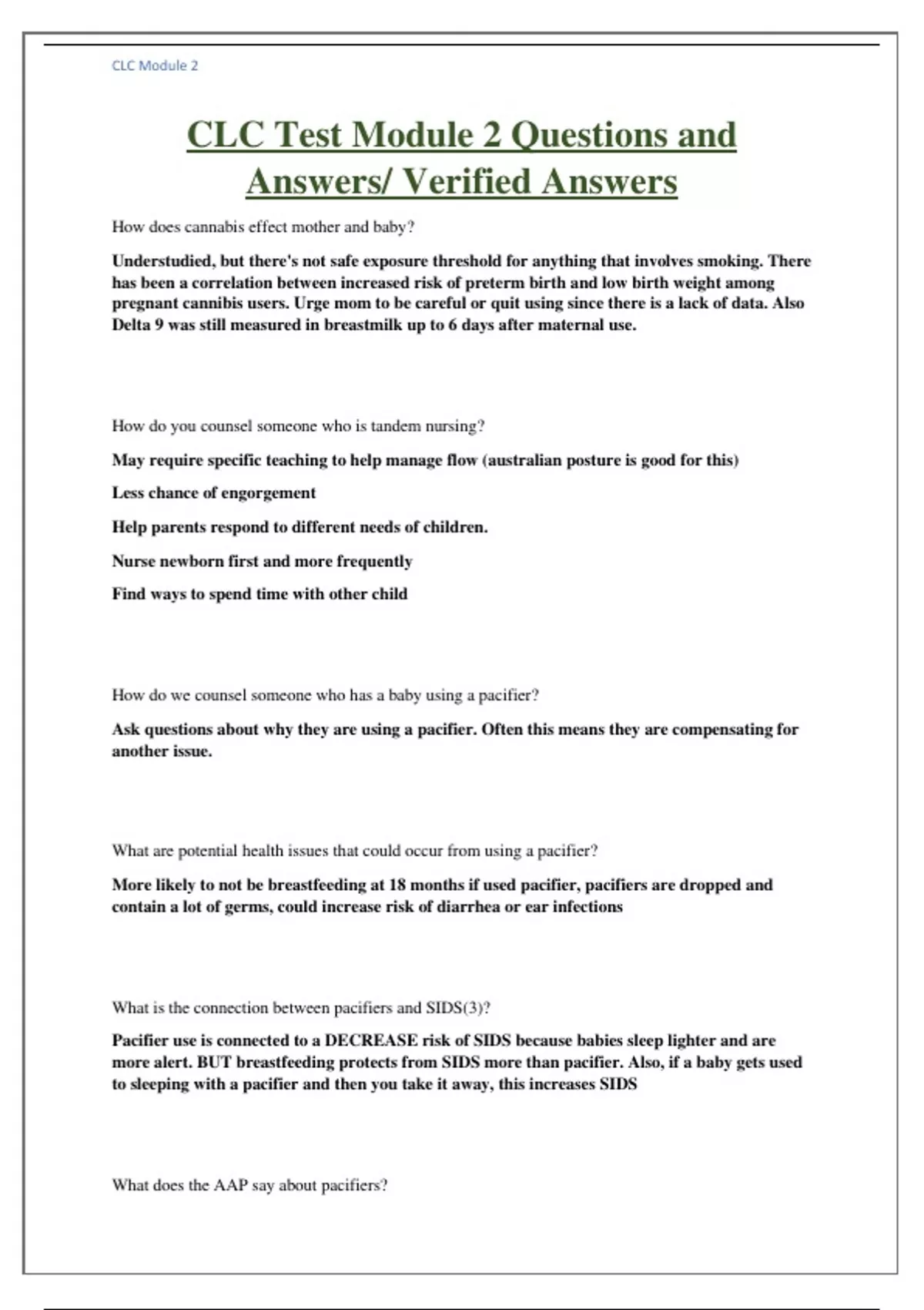 CLC Test Module 2 Questions and Answers/ Verified Answers How does cannabis effect mother and baby? Understudied, but there's not safe exposure threshold for anything that involves smoking. There has been a correlation between increased risk of preterm birth and low birth weight among pregnant cannibis users. Urge mom to be careful or quit using since there is a lack of data. Also Delta 9 was still measured in breastmilk up to 6 days after maternal use. How do you counsel someone who is tandem nursing? May require specific teaching to help manage flow (australian posture is good for this) Less chance of engorgement Help parents respond to different needs of children. Nurse newborn first and more frequently Find ways to spend time with other child How do we counsel someone who has a baby using a pacifier? Ask questions about why they are using a pacifier. Often this means they are compensating for another issue. What are potential health issues that could occur from using a pacifier? More likely to not be breastfeeding at 18 months if used pacifier, pacifiers are dropped and contain a lot of germs, could increase risk of diarrhea or ear infections What is the connection between pacifiers and SIDS(3)? Pacifier use is connected to a DECREASE risk of SIDS because babies sleep lighter and are more alert. BUT breastfeeding protects from SIDS more than pacifier. Also, if a baby gets used to sleeping with a pacifier and then you take it away, this increases SIDS What does the AAP say about pacifiers? delay use until breastfeeding is firmly established Are pacifiers beneficial for premies? Yes! They may have an earlier hospital discharge, tube fed babies gain weight faster with pacifiers because they help improve physiologic responses (like suckling) Do nipple shields help with breastfeeding? No! They can a decrease in milk supply by almost 60% (they are covering the nerves so sensation isn't as strong). Increased risk of readmission due to weight loss and hypernatremic dehydration. Babies get too used to being breastfed this way, if they are lost is difficult to feed, also risk of early weaning.