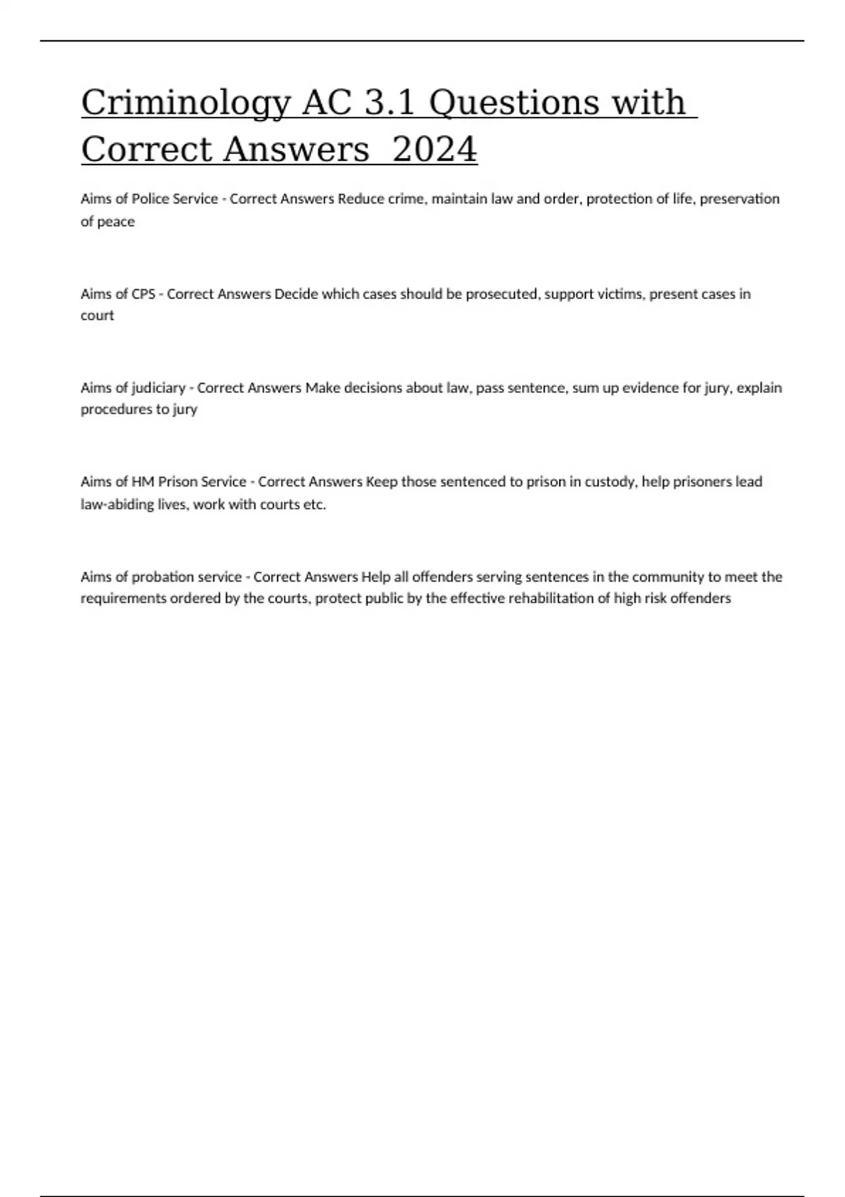 Aims of Police Service - Correct Answers Reduce crime, maintain law and order, protection of life, preservation of peace Aims of CPS - Correct Answers Decide which cases should be prosecuted, support victims, present cases in court Aims of judiciary - Correct Answers Make decisions about law, pass sentence, sum up evidence for jury, explain procedures to jury Aims of HM Prison Service - Correct Answers Keep those sentenced to prison in custody, help prisoners lead law-abiding lives, work with courts etc. Aims of probation service - Correct Answers Help all offenders serving sentences in the community to meet the requirements ordered by the courts, protect public by the effective rehabilitation of high risk offenders