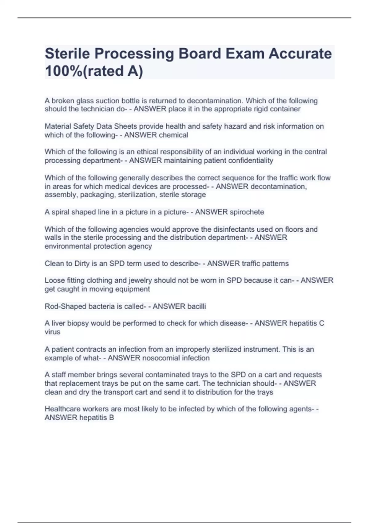 Sterile Processing Board Exam AA broken glass suction bottle is returned to decontamination. Which of the following should the technician do- - ANSWER place it in the appropriate rigid container Material Safety Data Sheets provide health and safety hazard and risk information on which of the following- - ANSWER chemical Which of the following is an ethical responsibility of an individual working in the central processing department- - ANSWER maintaining patient confidentiality Which of the following generally describes the correct sequence for the traffic work flow in areas for which medical devices are processed- - ANSWER decontamination, assembly, packaging, sterilization, sterile storage A spiral shaped line in a picture in a picture- - ANSWER spirochete Which of the following agencies would approve the disinfectants used on floors and walls in the sterile processing and the distribution department- - ANSWER environmental protection agency Clean to Dirty is an SPD term used to describe- - ANSWER traffic patterns Loose fitting clothing and jewelry should not be worn in SPD because it can- - ANSWER get caught in moving equipment Rod-Shaped bacteria is called- - ANSWER bacilli A liver biopsy would be performed to check for which disease- - ANSWER hepatitis C virus A patient contracts an infection from an improperly sterilized instrument. This is an example of what- - ANSWER nosocomial infection ccurate 100%(rated A)