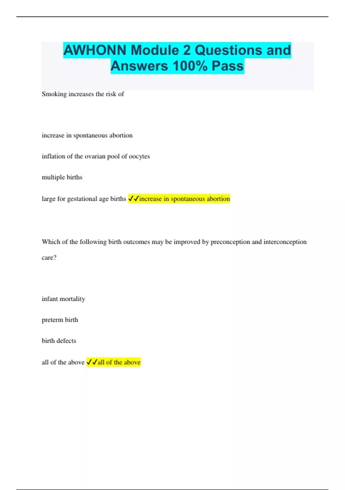 AWHONN Module 2 Questions and Answers 100% Pass Smoking increases the risk of increase in spontaneous abortion inflation of the ovarian pool of oocytes multiple births large for gestational age births increase in spontaneous abortion Which of the following birth outcomes may be improved by preconception and interconception care? infant mortality preterm birth birth defects all of the above all of the above Some foods are considered unsafe during pregnancy, and women may choose to avoid them during the preconception period. Undercooked meat and unwashed fruits and vegetables may expose women to which organism? campylobacter hepatitis B salmonella toxoplasma gondii toxoplasma gondii Women who are underweight may have difficulty conceiving due to which of the following conditions? anemia arrhythmias malnutrition oligo-ovulation oligo-ovulation Which statement is most accurate about asthma during pregnancy? it is safer for a woman to avoid pregnancy if she has asthma to avoid exacerbation of symptoms brought on by pregnancy it is safer for a pregnant woman to be treated with asthma medications than to have associated symptoms and exacerbated asthma it is safer for a pregnant woman to ingest asthma medications only asthma attacks it is safer for a woman with asthma to stay at home throughout her pregnancy it is safer for a pregnant woman to be treated with asthma medications than to have associated symptoms and exacerbated asthma Cultural sensitivity means that the healthcare provider is alert and considerate of others' views aware that there are other cultures in the world competent in cultures other than his/her own in a position to provide what the patient needs alert and considerate of others' views Increasing maternal and paternal age have been shown to influence the risk of preterm labor hydatidiform mole multiple gestation genetic abnormalities genetic abnormalities Women over the age of 35 have an increased risk of cesarean birth miscarriage and stillbirth pregnancy-related complications all of the above all of the above Access to care may be limited by all factors except lack of contraception medical insurance transportation trust in medical community contraception Interconception care should be provided to a woman anytime she is sexually active from first menstruation until around age 40 postpartum until she can no longer become pregnant only when she indicates she is considering another pregnancy postpartum until she can no longer become pregnant The first "a" in RADAR stands for access resources to assist in a safe escape alert authorities after hearing story about IPV allow time for gathering composure before telling story ask directly, in a kind, nonjudgmental way ask directly, in a kind, nonjudgmental way Women with chronic diseases who want to plan a pregnancy should not stop medications immediately be referred to an appropriate specialist switch to nonteratogenic medications delay conception until disease is optimized stop medications immediately All women of childbearing age should take which of the following per day to reduce the risk of neural tube defects? antacids ascorbic acid folic acid salicylic acid folic acid Healthcare providers should strive to provide preconception and interconception care to all women of childbearing age, which is generally considered to be 15-44 years of age 19-35 years of age 20-50 years of age women who request this information 15-44 years of age Depression, fatigue, weight gain, and difficulty concentrating may all be signs of which condition? cardiomyopathy diabetes hypothyroidism hyperthyroidism hypothyroidism Obese women (BMI ≥30) should gain how many pounds during pregnancy? 11-20 15-25 25-35 In nonpregnant women, obesity is defined as a body mass index (BMI) over 18 25 30 45 30 A tool used to screen for IPV is CAGE RADAR PHQ-9 Edinburgh scale RADAR Obesity can result in ovulatory dysfunction altered oocyte and endometrial functions lower birth rates all of the above ovulatory dysfunction Preconception care includes maximizing health between pregnancies during pregnancies throughout life all of the above all of the above Folic acid supplementation prior to and during pregnancy has been shown to reduce the risk of neural tube defects by at least 25% 45% 65% 85% 65% No amount of alcohol is safe during pregnancy. Fetal alcohol spectrum disorders include central nervous system abnormalities high-pitched crying macrocephaly neonatal hypothyroidism central nervous system abnormalities Methylmercury may be found in certain fishes and can adversely affect which fetal system? cardiovascular urinary neurologic skeletal neurologic Nadia has arrived for a routine annual physical examination. She does not maintain eye contact and provides only brief responses to questions during the physical assessment systems review. Upon physical examination, you notice bruises on her breasts, upper thighs, and genitals. Nadia begins to cry and states that her husband beats her. Your first action should be to assess Nadia's safety and ask if she has a safety plan bring Nadia to the emergency room for further evaluation call the police to report a case of IPV escort Nadia to a women's shelter in the city assess Nadia's safety and ask if she has a safety plan Anticipatory guidance is an important part of preconception and interconception care because the following percentage of all pregnancies in the United States are unintended. 15% 25% 45% 75% 45%