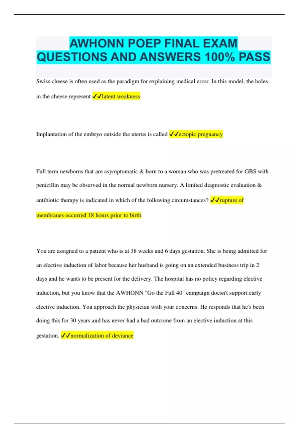 AWHONN POEP FINAL EXAM QUESTIONS AND ANSWERS 100% PASS Swiss cheese is often used as the paradigm for explaining medical error. In this model, the holes in the cheese represent latent weakness Implantation of the embryo outside the uterus is called ectopic pregnancy Full term newborns that are asymptomatic & born to a woman who was pretreated for GBS with penicillin may be observed in the normal newborn nursery. A limited diagnostic evaluation & antibiotic therapy is indicated in which of the following circumstances? rupture of membranes occurred 18 hours prior to birth You are assigned to a patient who is at 38 weeks and 6 days gestation. She is being admitted for an elective induction of labor because her husband is going on an extended business trip in 2 days and he wants to be present for the delivery. The hospital has no policy regarding elective induction, but you know that the AWHONN "Go the Full 40" campaign doesn't support early elective induction. You approach the physician with your concerns. He responds that he's been doing this for 30 years and has never had a bad outcome from an elective induction at this gestation. normalization of deviance A shared understanding of what is going on & what is likely to happen next is known as situational awareness A patient safety event, unrelated to the natural course of the underlying illness, that reaches a patient and results in death, permanent harm, or severe temporary harm with intervention required to sustain life is an example of sentinel event Which tool is used when an adverse event has occurred to identify variations in performance that led to the outcome? root cause analysis Yearly objectives developed by The Joint Commission that focus on problems in healthcare safety are known as National patient safety goals Authoritative statements of the duties that all registered nurses, regardless of role, population, or specialty are expected to perform competently are defined standards of care Position statements are recommendations for a pathway of action regarding a particular issue In health care, an unplanned event that did NOT result in injury, illness, or damage but had the potential to do so is referred to as a near miss All of the following are elements of good documentation EXCEPT inclusion of nursing opinion as to causes of error. Which of the following is NOT a component of the risk reduction strategy known as closed loop communication? is only used in emergency patient care situations You are a nurse on the mother/baby unit caring for a woman who is 12 hours postpartum from an operative vaginal delivery with midline episiotomy. The woman has severe rectal pain and reports inability to urinate. You suspect a vaginal hematoma and call her physician to request an evaluation. The physician does not respond. Under these circumstances it is appropriate to institute the chain of communication. Team training is an effective risk management strategy because it outlines effective communication tools and techniques. Which two medications frequently used in the perinatal setting are identified as high-risk medications by the Institute for Safe Medication Practices (ISMP)? magnesium sulfate & oxytocin Successful defense against malpractice claims is enhanced by which of the following? Following national professional standards. One of the MOST common and well documented risk factors for preterm labor is previous history of preterm birth Ms. Linghu arrived at the obstetric care unit for a labor evaluation. She is 28 weeks gestation and is complaining of a lower back ache and cramping. The physician has asked for assistance in obtaining a sample to assess for fetal fibronectin (fFN). Which statement about fFN is MOST accurate? fFN is a strong predictor or marker for identification of preterm labor. A cerclage placed in women with documented shortened cervical length by ultrasound examination is called ultrasound indicated cerclage Current recommendations for antenatal glucocorticoid administration for acceleration of fetal lung maturation is appropriate for women at 24 0/7-33 6/7 weeks gestation at risk for preterm birth within 7 days. Which of the following is a contraindication for magnesium