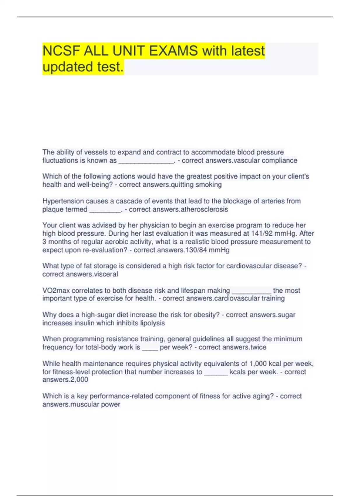 NCSF ALL UNIT EXAMS with latest updated test. The ability of vessels to expand and contract to accommodate blood pressure fluctuations is known as ______________. - correct lar compliance Which of the following actions would have the greatest positive impact on your client's health and well-being? - correct ing smoking Hypertension causes a cascade of events that lead to the blockage of arteries from plaque termed ________. - correct osclerosis Your client was advised by her physician to begin an exercise program to reduce her high blood pressure. During her last evaluation it was measured at 141/92 mmHg. After 3 months of regular aerobic activity, what is a realistic blood pressure measurement to expect upon re-evaluation? - correct answers.130/84 mmHg What type of fat storage is considered a high risk factor for cardiovascular disease? - correct ral VO2max correlates to both disease risk and lifespan making __________ the most important type of exercise for health. - correct ovascular training Why does a high-sugar diet increase the risk for obesity? - correct increases insulin which inhibits lipolysis When programming resistance training, general guidelines all suggest the minimum frequency for total-body work is ____ per week? - correct While health maintenance requires physical activity equivalents of 1,000 kcal per week, for fitness-level protection that number increases to ______ kcals per week. - correct answers.2,000 Which is a key performance-related component of fitness for active aging? - correct lar power Routine, moderate-intensity jogging will have what affect on one's blood lipid profile? - correct answers.HDL will increase Which of the following would have the greatest impact on health for an individual who is overweight and inactive? - correct g daily physical activity What is the correct movement of the glenohumeral joint during the tricep pushdown exercise? - correct joint movement What is the dual-action muscle of the quadriceps; allowing it to act upon both the hip and knee joints? - correct s femoris What is the term used to describe the natural curvature of the cervical and lumbar spine? - correct tic All of the following are rotator cuff muscles, except: - correct or scapulae Which muscle is responsible for the first 30 degrees of trunk flexion and is targeted during the crunch movement? - correct s abdominis When the hip and knee are fully flexed as seen in the single-leg squat (Bulgarian squat), what hip extensor is the prime mover? - correct us maximus What muscle acts as the agonist during performance of the Romanian deadlift? - correct rings During the descent phase of the standing barbell curl, the biceps contract _________. - correct trically The prime mover of the dumbbell side raise exercise is the ______________. - correct id Retraction of the scapula during the seated row is caused by: - correct ntric contraction of the rhomboids The majority of back injuries from incorrect lifting occur between which segments of the spine? - correct r and sacrum __________ refers to a spatial familiarity from improvements in the nervous system. - correct answers.Proprioception The deltoid becomes the primary abductor of the humerus beginning at what joint angle; reducing involvement of the rotator cuff? - correct answers.30° The performance of a lunge with forward press on a cable machine occurs in which movement plane? - correct tal