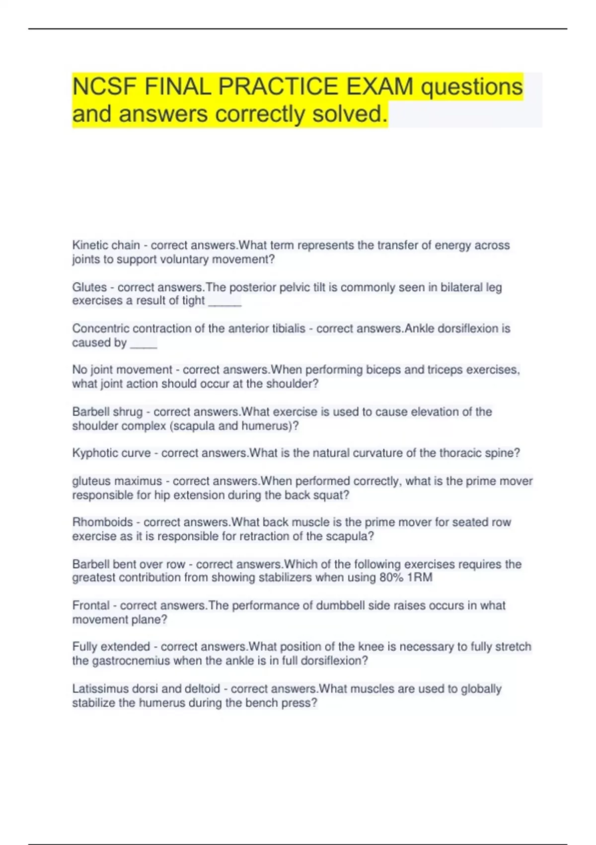 NCSF FINAL PRACTICE EXAM questions and answers correctly solved. Kinetic chain - correct answers.What term represents the transfer of energy across joints to support voluntary movement? Glutes - correct answers.The posterior pelvic tilt is commonly seen in bilateral leg exercises a result of tight _____ Concentric contraction of the anterior tibialis - correct answers.Ankle dorsiflexion is caused by ____ No joint movement - correct answers.When performing biceps and triceps exercises, what joint action should occur at the shoulder? Barbell shrug - correct answers.What exercise is used to cause elevation of the shoulder complex (scapula and humerus)? Kyphotic curve - correct answers.What is the natural curvature of the thoracic spine? gluteus maximus - correct answers.When performed correctly, what is the prime mover responsible for hip extension during the back squat? Rhomboids - correct answers.What back muscle is the prime mover for seated row exercise as it is responsible for retraction of the scapula? Barbell bent over row - correct answers.Which of the following exercises requires the greatest contribution from showing stabilizers when using 80% 1RM Frontal - correct answers.The performance of dumbbell side raises occurs in what movement plane? Fully extended - correct answers.What position of the knee is necessary to fully stretch the gastrocnemius when the ankle is in full dorsiflexion? Latissimus dorsi and deltoid - correct answers.What muscles are used to globally stabilize the humerus during the bench press? Standing single arm dumbbell press - correct answers.Based on the principles of stability what exercise would be most difficult to stabilize? Take a broader step and push the back leg downward - correct answers.To correct error in a lunge the client should be instructed to ____ Proprioception - correct answers.Which of the following refers to the cumulative input to the nervous system that relays body and position of movement? Hip abductors - correct answers.What muscle is the prime mover for lateral lunge performed in the picture? Rhomboids - correct answers.Client should be instructed to retract the scapula dreamed of seated row exercise in order to effectively train the: Mitochondria - correct answers.Aerobic metabolism in the muscle cell occurs within which organelle? Testosterone - correct answers.What anabolic hormone is released in higher concentrations in response to heavy resistance training? Seated leg extension and hamstring stretch - correct answers.Which pair of movements employ reciprocal inhibition in a training session aimed at improving strength and flexibility? Glycogen - correct answers.Which of the following is the only energy substrate that can be metabolized aerobically or anaerobically to produce ATP? Isometric - correct answers.What type of contraction is performed by the abdominals and erector spinae muscle group during the performance of a push-up? Respiration rates increase - correct answers.What physiological response occurs when lactic buildup in the blood? Intensity of exercise - correct answers.What has the greatest impact on relative hormonal response during exercise? Inadequate carbohydrates - correct answers.What causes the protein sparing mechanism to shut off during exercise? Smaller relative heart side - correct answers.Besides body differences in muscle mass and strength capabilities why do females have lower cardiac output's compared to males? Capillaries - correct answers.To optimize aerobic capacity to body increases oxygen delivery and extraction by adding: It is optimal as the body is warm, preexercise static stretching can reduce power output, it can help with the cool down and return to a homeostasic state - correct answers.Why is it recommended to perform static stretches following exercise, and not before? Nervous system - correct answers.Which system of the body has the greatest adoption rate when exposed to a new training stimulus? 24 to 48 hours after a training session ends - correct answers.Delayed onset muscle soreness generally appears: Heart rate - correct answers.Stroke volume levels off at about 40% VO to Max forcing the body to rely strictly on increased _____ to manage cardiac output as the intensity rises. Soleus - correct answers.Which of the following is a postural muscle characterized by a relatively greater slow twitch fibers density? Reducing chronic psychological stress - correct answers.Which of the following recommendations would directly reduce the risk for heart disease? Vascular compliance - correct answers.Advancing age and disease reduce vessel responsiveness called _____ which increases risk for cardiovascular disease and stroke. Aerobic - correct answers.Which type of exercise is most associated with measures of health and life expectancy? HDL will increase - correct answers.What effect does routine, moderate intensity aerobic training have on one's blood lipid profile? Android obesity is linked with heart disease - correct answers.Increased midsection girth with age is a concern because: Increased stroke volume - correct answers.What adaptation to aerobic exercise reduces heart rates at rest during submaximal exercise? Reduced HDL - correct answers.What negative affect does trans fat have on blood lipid profiles? Smoking cigarettes - correct answers.What is the most unhealthy behavior as measured by risk for heart disease?