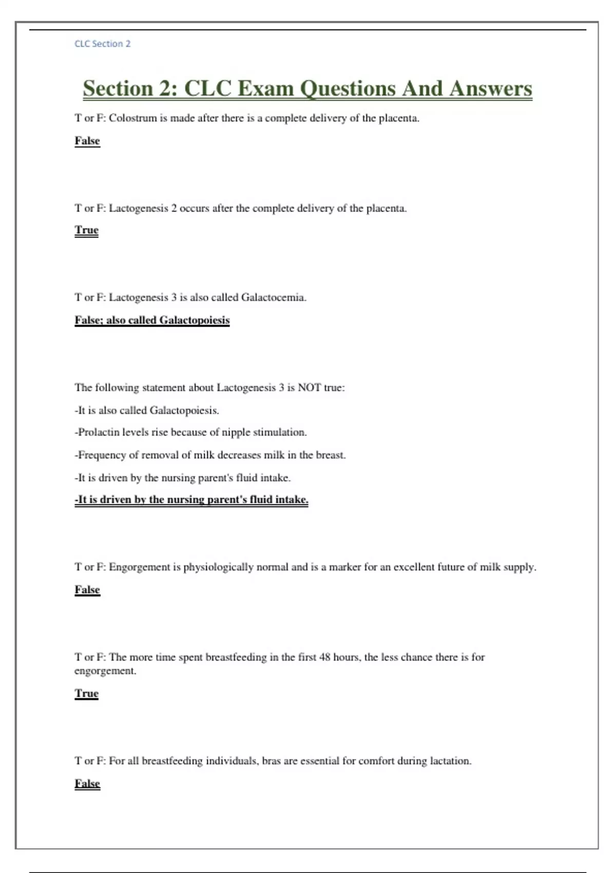 Section 2: CLC Exam Questions And Answers T or F: Colostrum is made after there is a complete delivery of the placenta. False T or F: Lactogenesis 2 occurs after the complete delivery of the placenta. True T or F: Lactogenesis 3 is also called Galactocemia. False; also called Galactopoiesis The following statement about Lactogenesis 3 is NOT true: -It is also called Galactopoiesis. -Prolactin levels rise because of nipple stimulation. -Frequency of removal of milk decreases milk in the breast. -It is driven by the nursing parent's fluid intake. -It is driven by the nursing parent's fluid intake. T or F: Engorgement is physiologically normal and is a marker for an excellent future of milk supply. False T or F: The more time spent breastfeeding in the first 48 hours, the less chance there is for engorgement. True T or F: For all breastfeeding individuals, bras are essential for comfort during lactation. False T or F: Breast surgery can potentially impact breastfeeding. True T or F: Peri-areolar incisions with breast surgery are least significantly associated with milk insufficiency. False; Peri-areolar incisions are MOST likely associated w/ milk insufficiency When considering both chest masculinization surgery and breast reduction surgery: -The likelihood of breastfeeding is unknown. -Assessment and close nutritional follow up is key. -It is important to assure nutrition of the infant. -All of the above All of the above T or F: Suboptimal breast anatomy can potentially impact breastfeeding and should be seen as a "red flag" for close assessment and follow up. True T or F: Hypoplastic breasts always make ample milk. False T or F: There is no concern when a client reports a breast implant on only one side. False; This could indicate history of discrepant breast size. T or F: With flat and inverted nipples, there will be inadequate production of milk-making hormones because prolactin involves nipple stretching while oxytocin involves nipple stroking. False. Prolactin = nipple stroking Oxytocin = nipple stretching