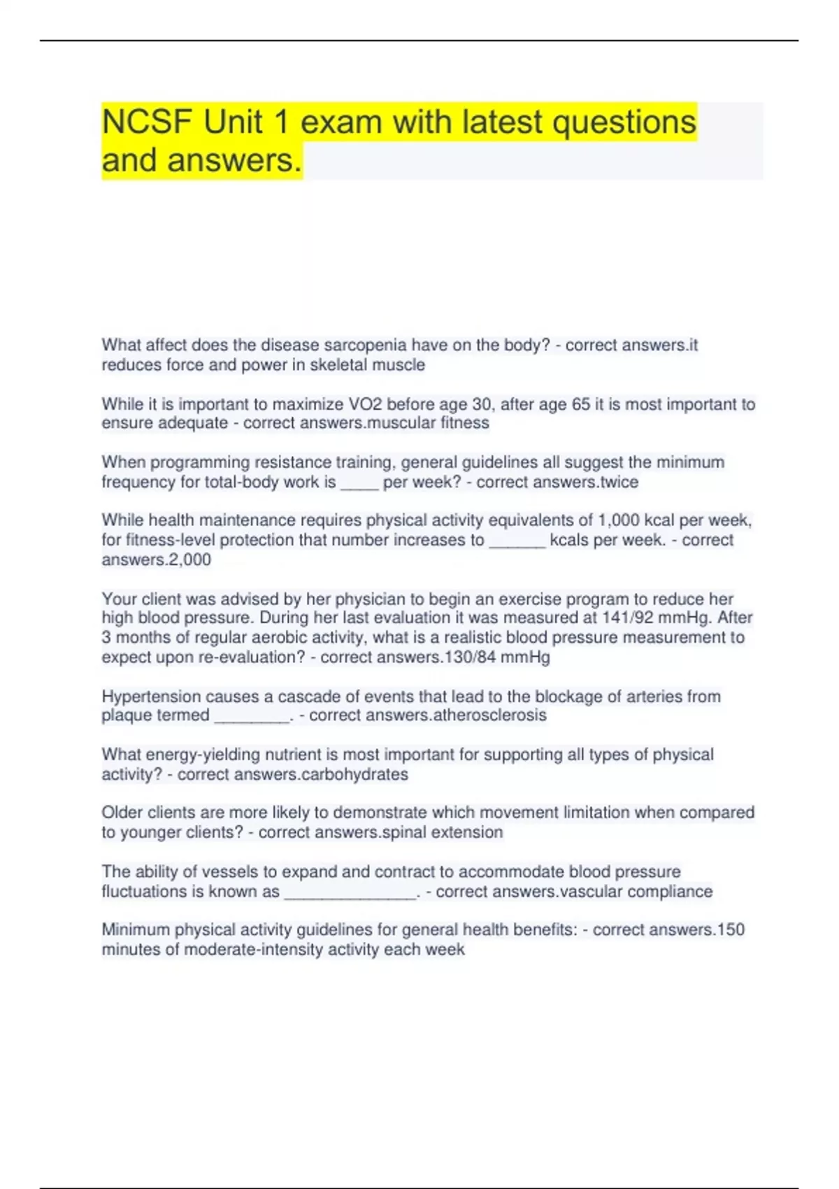 NCSF Unit 1 exam with latest questions and answers. What affect does the disease sarcopenia have on the body? - correct reduces force and power in skeletal muscle While it is important to maximize VO2 before age 30, after age 65 it is most important to ensure adequate - correct lar fitness When programming resistance training, general guidelines all suggest the minimum frequency for total-body work is ____ per week? - correct While health maintenance requires physical activity equivalents of 1,000 kcal per week, for fitness-level protection that number increases to ______ kcals per week. - correct answers.2,000 Your client was advised by her physician to begin an exercise program to reduce her high blood pressure. During her last evaluation it was measured at 141/92 mmHg. After 3 months of regular aerobic activity, what is a realistic blood pressure measurement to expect upon re-evaluation? - correct answers.130/84 mmHg Hypertension causes a cascade of events that lead to the blockage of arteries from plaque termed ________. - correct osclerosis What energy-yielding nutrient is most important for supporting all types of physical activity? - correct hydrates Older clients are more likely to demonstrate which movement limitation when compared to younger clients? - correct l extension The ability of vessels to expand and contract to accommodate blood pressure fluctuations is known as ______________. - correct lar compliance Minimum physical activity guidelines for general health benefits: - correct answers.150 minutes of moderate-intensity activity each week