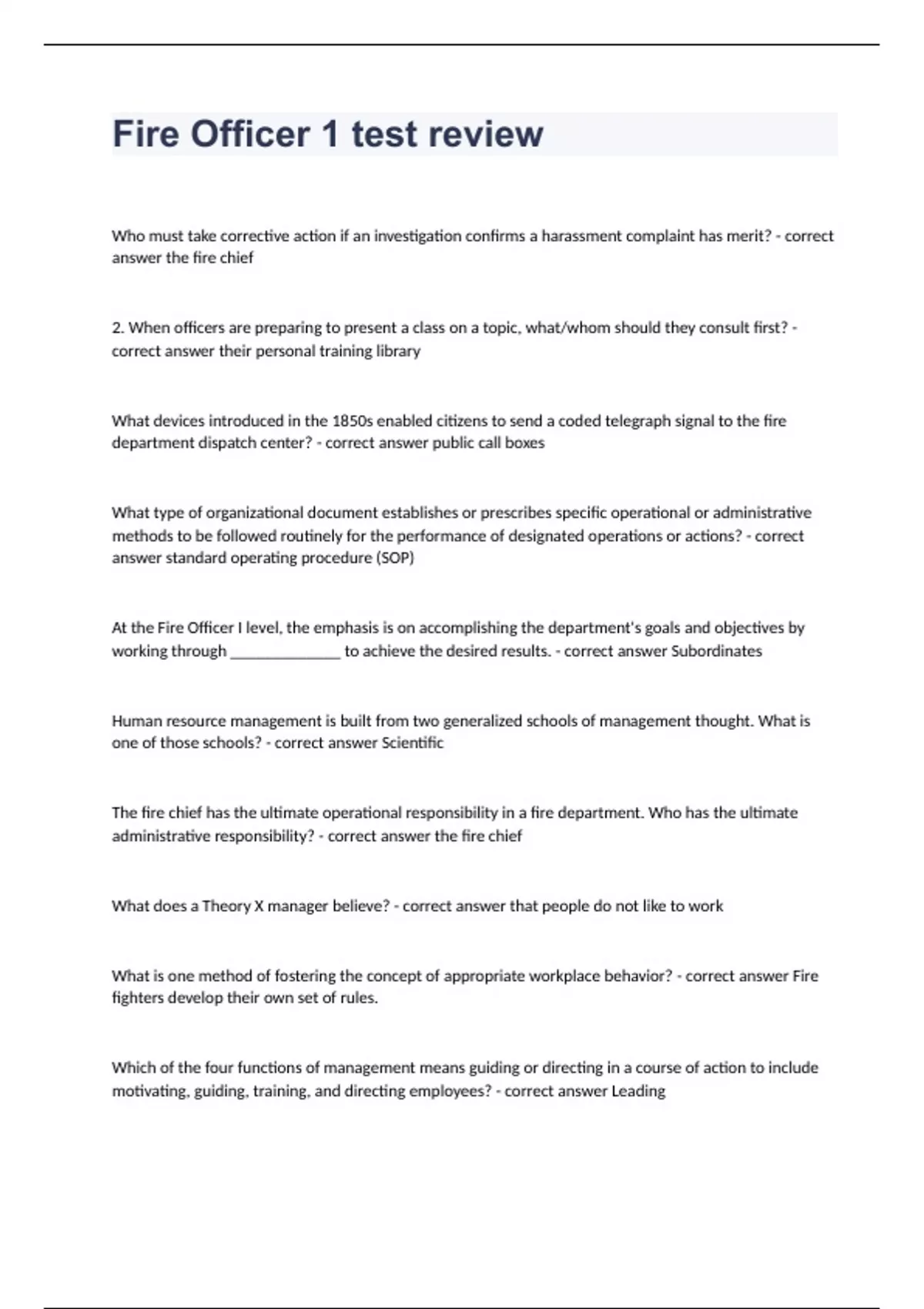 Fire Officer 1 test review Question and answers already passed 2023/2024Who must take corrective action if an investigation confirms a harassment complaint has merit? - correct answer the fire chief 2. When officers are preparing to present a class on a topic, what/whom should they consult first? - correct answer their personal training library What devices introduced in the 1850s enabled citizens to send a coded telegraph signal to the fire department dispatch center? - correct answer public call boxes What type of