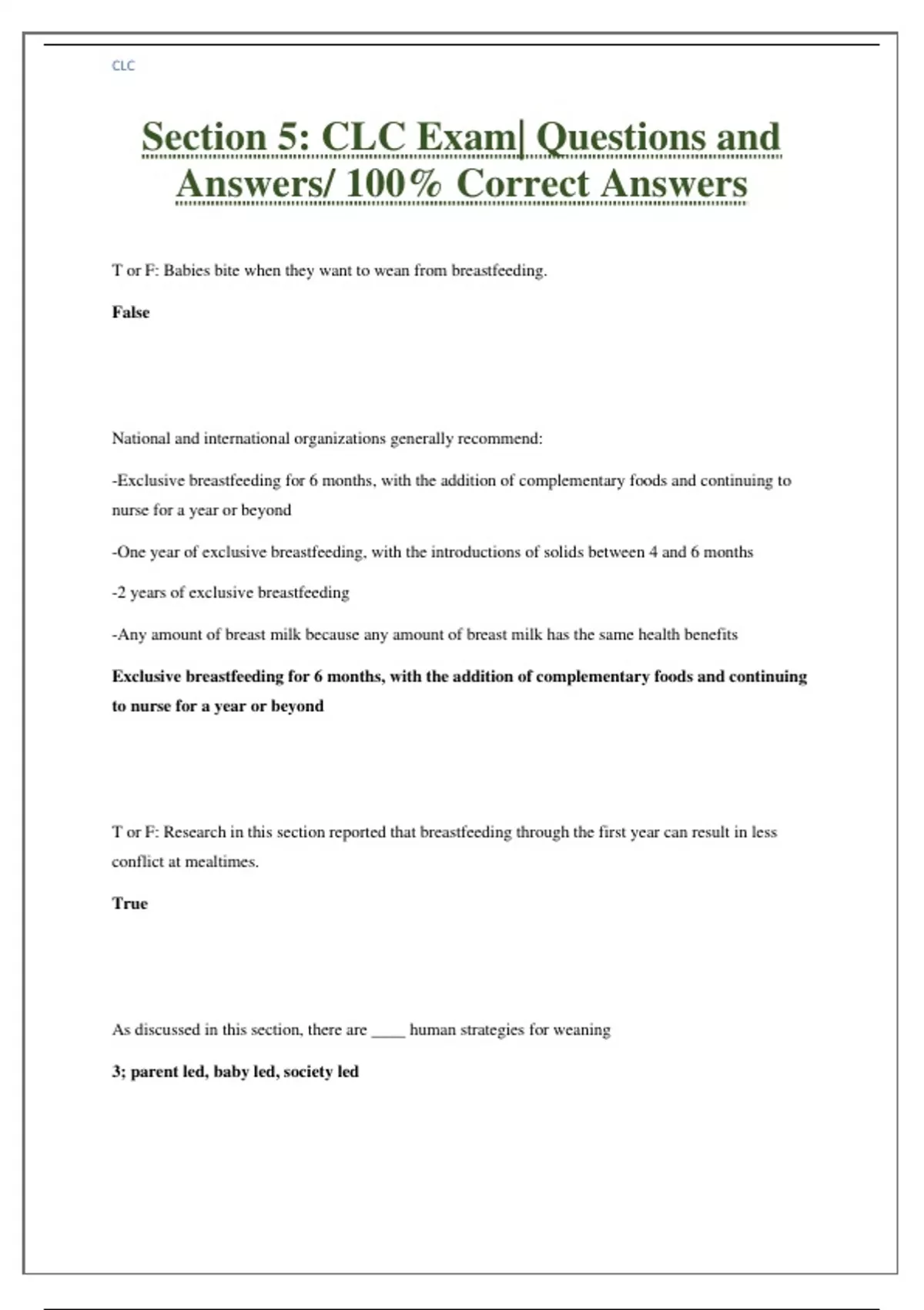 Section 5: CLC Exam| Questions and Answers/ 100% Correct Answers T or F: Babies bite when they want to wean from breastfeeding. False National and international organizations generally recommend: -Exclusive breastfeeding for 6 months, with the addition of complementary foods and continuing to nurse for a year or beyond -One year of exclusive breastfeeding, with the introductions of solids between 4 and 6 months -2 years of exclusive breastfeeding -Any amount of breast milk because any amount of breast milk has the same health benefits Exclusive breastfeeding for 6 months, with the addition of complementary foods and continuing to nurse for a year or beyond T or F: Research in this section reported that breastfeeding through the first year can result in less conflict at mealtimes. True As discussed in this section, there are ____ human strategies for weaning 3; parent led, baby led, society led