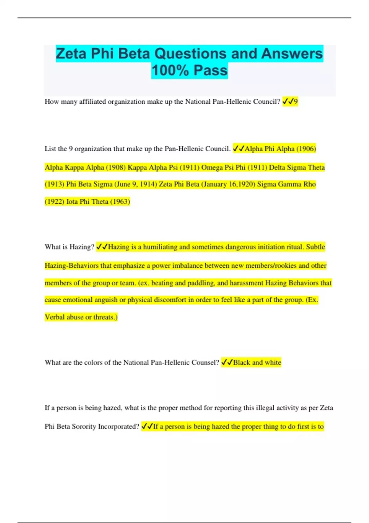 Zeta Phi Beta Questions and Answers 100% Pass How many affiliated organization make up the National Pan-Hellenic Council? 9 List the 9 organization that make up the Pan-Hellenic Council. Alpha Phi Alpha (1906) Alpha Kappa Alpha (1908) Kappa Alpha Psi (1911) Omega Psi Phi (1911) Delta Sigma Theta (1913) Phi Beta Sigma (June 9, 1914) Zeta Phi Beta (January 16,1920) Sigma Gamma Rho (1922) Iota Phi Theta (1963) What is Hazing? Hazing is a humiliating and sometimes dangerous initiation ritual. Subtle Hazing-Behaviors that emphasize a power imbalance between new members/rookies and other members of the group or team. (ex. beating and paddling, and harassment Hazing Behaviors that cause emotional anguish or physical discomfort in order to feel like a part of the group. (Ex. Verbal abuse or threats.) What are the colors of the National Pan-Hellenic Counsel? Black and white If a person is being hazed, what is the proper method for reporting this illegal activity as per Zeta Phi Beta Sorority Incorporated? If a person is being hazed the proper thing to do first is to report the MIP Coordinator and if that does not solve the issue, you then call the State director and if that does not solve the issue, you then call International headquarters. What is the name of the Anti-Hazing Campaign Finer Women Don't Haze Campaign When and where was the National Pan-Hellenic Council Organized? May 10, 1930 at Howard University, Washington D.C It was Incorporated as perpetual in 1937. What is the state purpose of the National Pan-Hellenic Council? The state purpose and mission of the organization in 1930 "Unanimity of thought and action as far as possible in conduct of Greek letter collegiate fraternities and sororities, and to consider problems of mutual inters to its members organization. What affiliate organizations of the National Pan-Hellenic Council were not founded at Howard University in Washington D.C.? Alpha Phi Alpha, Kappa Alpha Psi, Sigma Gamma Rho, Iota Phi Theta In what year sis the council of President define hazing? 1990 When and where was Zeta Phi Beta Sorority Incorporated founded? January 16, 1920 at Howard University in Washington D.C. Five Founders Arizona Cleaver Stemons Myrtle Tyler Faithful Viola Tyler Goings Fannie Pettie Watts Pearl Ann Neal Zeta Phi Beta Principles Sisterhood Service Scholarship Finer womanhood When and where was Zeta Phi Beta Sorority Incorporated March 30, 1923 District of Columbia One out of two name and location of Z Phi B Sorority National Headquarter located at 1734 New Hampshire Ave. N.W. in Washington, D.C. Two of Two of Z phi B name and location of Sorority Summer Cottage Birch Haven located in Idlewild, Michigan Name the only constitutional bound fraternity and sorority in the National Pan-Hellenic Council Zeta Phi Beta Sorority and Phi Beta Sigma Fraternity What is the name of the adult auxiliary for women? Amicae (Friend) When and where was the first Boule of Zeta Phi Beta Sorority, Incorporated held? December 26th-28th, 1920 Washington D.C. Name Zeta's youth auxiliary organized for girls ages 4-8 Pearlette Name the Zeta auxiliary for girls ages 9-13 Amicette Name the Zeta auxiliary for girls 14-18 Archonette What is the purpose of Zeta male Network to provide opportunities for companionship, cooperation with Zeta on service projects, and participation in social and cultural activities. International Grand Basileus Mary Breaux Wright Sheryl P. Underwood Barbara C. Moore Dr. Barbara West Carpenter Dr. Jylia Moore Foster Tearte Dr. Edith V. Francis When is it appropriate to distribute and internal communication outside the Sorority? Never This document is the highest law of Zeta. The sorority is governed by it as well as the policies and procedures voted on by chapter delegates at the Sorority's biennial boule. Constitution This group of Sorors oversees the upkeep of the Sorority's real property. National Trustees These types of chapters are distinguished by the use of "Zeta" at the end of the chapter's name Graduate These types of chapters are named by the Greek letters in order of the Greek Alphabet Undergraduate This national observance is celebrated the last full week in February and the month of March Finer Womanhood Day This National observance is celebrated to commemorate the founding of the sorority National Founders Day This is a non-profit subsidiary of the sorority which was established not only to provide scholarship assistance to undergraduate and graduate students, but also to include and encourage the promotion of education, educational research and community services, and the development of programs. National Education Foundation This group of Sorors is responsible for overseeing the implementation of policies established during the Boule, overseeing the operation of the sorority and its budget, and acting on issues that arise between Boules. National Executive Board This Soror wrote the lyrics to our national hymn Anita Turpeau This is the only position on the National Executive Board that is appointed rather than elected Regional Director List at least 3 ways in which Zeta women provide services to their communities Food and clothing drive, Contribute to organizing charities, provide tutorial service to enhance the literacy of community relations Write the name of your region South Central Region List the states that are included in your region Alabama, Arkansas, Mississippi, and Tennessee One of three past or current national projects 1943, The Housing Project was initiated. Involved locating housing vacancies for World War II veterans Two of three past or current national projects October 1965, Operation Bootstrap, Ten point program that included parent-child training programs Three of three current and past national projects 1972, The Stork's Nest project, assist children and pregnant women for prenatal care. Nu Kappa Zeta chapter founders in 1986 Patricia Scott Dr. Alice Powell Allures B. Davis Linda Stewart Joycie Bright Phi Beta Sigma