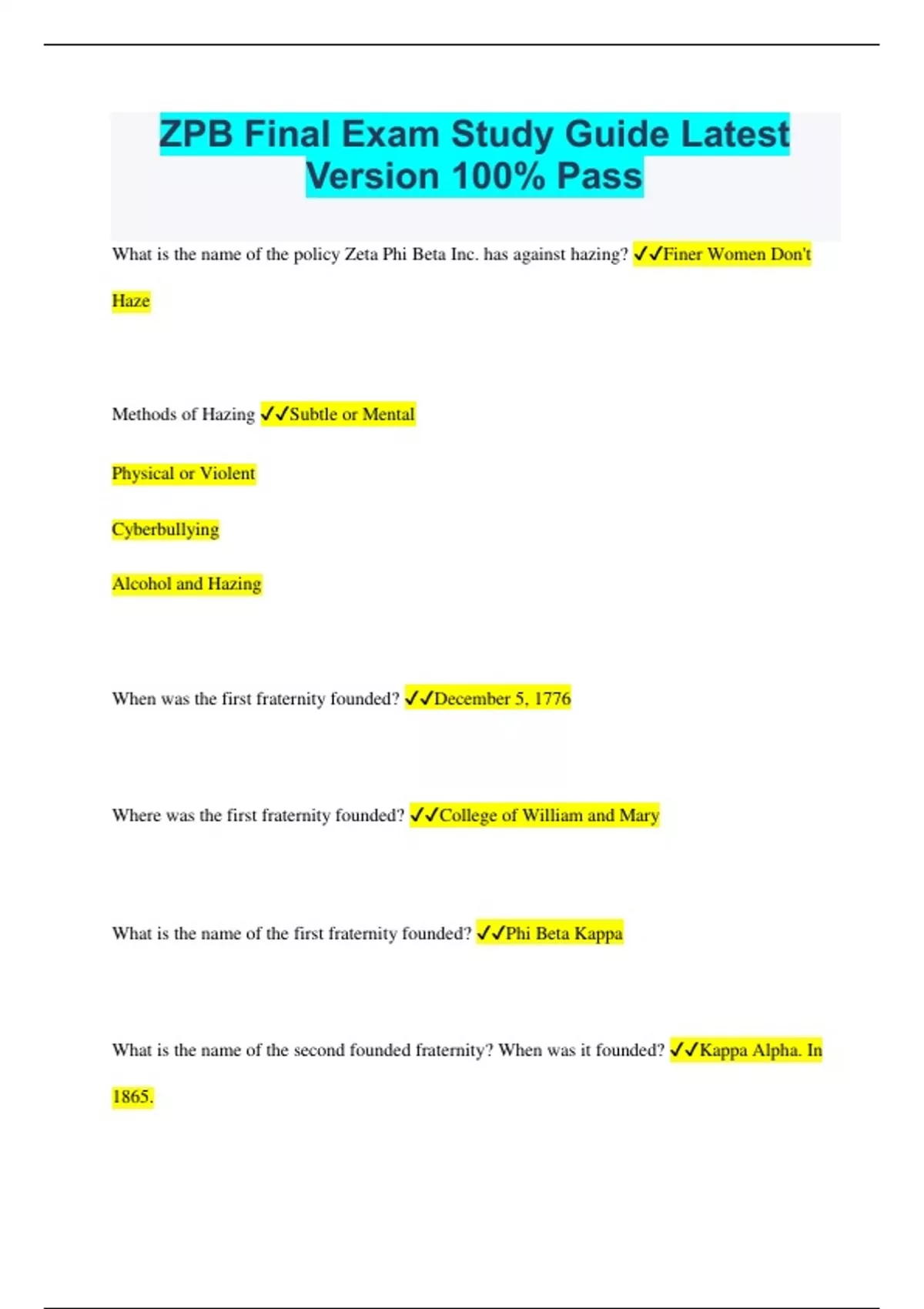 ZPB Final Exam Study Guide Latest Version 100% Pass What is the name of the policy Zeta Phi Beta Inc. has against hazing? Finer Women Don't Haze Methods of Hazing Subtle or Mental Physical or Violent Cyberbullying Alcohol and Hazing When was the first fraternity founded? December 5, 1776 Where was the first fraternity founded? College of William and Mary What is the name of the first fraternity founded? Phi Beta Kappa What is the name of the second founded fraternity? When was it founded? Kappa Alpha. In 1865. Where was the first sorority founded? Where? Wesleyan College. Macon, Georgia Where was the first national sorority founded at? When? Monmouth College. 1867. Who is the first African-American fraternity? Founded when and where? Alpha Phi Alpha Fraternity Inc. @Cornell University in December 4th 1906 Second NPHC/D9 Fraternity Founded Kappa Alpha Psi Fraternity Inc. January 5th, 1911 @Indiana University Third NPHC/D9 Fraternity Founded Omega Psi Phi Fraternity Inc. November 17th 1911 @Howard University Fourth NPHC/D9 Fraternity Founded Phi Beta Sigma Fraternity Inc. January 9th 1914 @Howard University Fifth NPHC/D9 Fraternity Founded Iota Phi Theta Fraternity Inc. September 19th 1963 @Morgan State College, Now know as Morgan State University First NPHC/D9 Sorority Founded Alpha Kappa Alpha Sorority Inc. January 15th 1908 @Howard University Second NPHC/D9 Sorority Founded Delta Sigma Theta Sorority Inc. January 13th 1913 @Howard University Third NPHC/D9 Sorority Founded Zeta Phi Beta Sorority Inc. January 16th 1920 @Howard University Fourth NPHC/D9 Sorority Founded Sigma Gamma Rho Sorority Inc. November 12th 1922 @Buter University How many fraternities and sororities make up NPHC? Nine. Five Fraternities, Four Sororities. How many of the NPHC was founded at Howard University? Five When was the NPHC founded/organized? May of 1930 @Howard University Who Are The Charter Members for the NPHC? Kappa Alpa Psi, Omega Psi Phi, Alpha Kappa Alpha, Delta Sigma Theta, Zeta Phi Beta When did Alpha Phi Alpha and Phi Beta Sigma join the NPHC? In 1931 When did Sigma Gamma Rho join the NPHC? In 1937 When did Iota Phi Theta join the NPHC? In 1996 What is the stated purpose of NPHC in 1930? "Unanimity of thought and action as far as possible in the conduct of Greek-lettered collegiate fraternities and sororities and to consider problems of mutual interest to its member organizations." - Greek Unity Who makes up the Divine 9? Alpha Phi Alpha, Alpha Kappa Alpha, Kappa Alpha Psi, Omega Psi Phi, Delta Sigma Theta, Phi Beta Sigma, Zeta Phi Beta, Sigma Gamma Rho, Iota Phi Theta What are the NPHC's colors? Black and White Zeta Phi Beta Sorority, Inc. January 16th, 1920 @Howard University, Royal Blue and White, The Archonian Phi Beta Sigma Fraternity, Inc. January 9th, 1914 @Howard University, Royal Blue and Pure White, The Crescent Alpha Phi Alpha Fraternity, Inc. December 4th, 1906 @Cornell University, Black and Old Gold, The Sphinxmen Alpha Kappa Alpha Sorority, Inc. January 15th, 1908 @Howard University, Salmon Pink and Apple Green, The Ivy Leaf Kappa Alpha Psi Fraternity, Inc. January 5th, 1911 @Indiana University, Crimson and Cream, The Scrollers Omega Psi Phi Fraternity, Inc. November 17th, 1911 @Howard University, Royal Purple and Gold, The Lampados Delta Sigma Theta Sorority, Inc. January 13th, 1913 @Howard University, Crimson and Cream, The Pyramid Sigma Gamma Rho Sorority, Inc. November 12th, 1922 @Butler University, Royal Blue and Gold, The Aurora Iota Phi Theta Fraternity, Inc. September 19th, 1963 @Morgan State University, Charcoal Brown and Gilded Gold, The Centaur What are the founders called? The Five Pearls Who Are The Five Founders in Order of Joining? Arizona Cleaver Stemons, Pearl Anna Neal, Viola Tyler Goings, Myrtle Tyler Faithful, Fannie Pettie Watts When and Where was Zeta Phi Beta Incorporated? March 30th, 1923 in Washington,DC What is Zeta Phi Beta Inc. Purpose? To foster the ideals of Service, charity, Scholarship, civil and cultural endeavors. Sisterly Love, and Finer Womanhood When was the first official meeting of Zeta Phi Beta Sorority Inc? Where was the meeting held? January 16th, 1920 @Miner Hall, Arizona Cleaver's dorm When and what was the first publication of the sorority? In 1921, X-Ray Who was the first editor of the X-Ray? Grace Bradley of Atlanta Who Are the first five International Grand Basilei? 1920 - Arizona Cleaver Stemons 1921 - Myrtle Tyler Faithful 1922 - Joanna Houston Ransom 1923 - Nellie Buchanan 1925 - Dr. S. Evelyn Lewis Who Are the last five International Grand Basilei? 1992 - Dr. Jylla Moore Foster Tearte 1996 - Dr. Barbara West Carpenter 2002 - Barbara C. Moore 2008 - Sheryl P. Underwood 2012 - Mary Breaux Wright Who is the current International Grand Basileus? 2018 - Valerie Hollingsworth Baker When were pledge clubs discontinued? In 1990 What are five Sorority Firsts? -First Greek Lettered Org to Organize a chapter in 1948, Delta Iota Zeta chapter and Upsilon Beta chapter @ Libera, Africa -First to establish a first national executive office of a black sorority in 1948 -First to establish national auxiliaries -First and only NPHC to be constitutionally bound to a fraternity, Phi Beta Sigma Fraternity Inc. -First Sorority to Charter a chapter south of the mason dixon line When and where was the first Amicae chapter organized? 1947 in Omaha,Nebraska Who chartered the first Amicae chapter? Gertrude Lucas Craig, Belma Mahan Hawkins, Asilee Doston Garland, and Lucyle Avant of the Beta Psi Zeta Chapter What Happened once the first Amicae chapter was charted? This made Zeta Phi Beta Sorority the first org in the NPHC to organize an auxiliary group Who was the first Amicae president? Where is she from? Adelaide Forde, Houston, Texas Name the 3 Youth Auxiliary Groups? Pearlettes - 4 to 8 years old Amicettes - 9 to 13 years old Archonettes - 14 to 18 years old What two properties does Zeta Phi Beta Sorority Inc. Own? National Headquarters - 1734 New Hampshire Ave