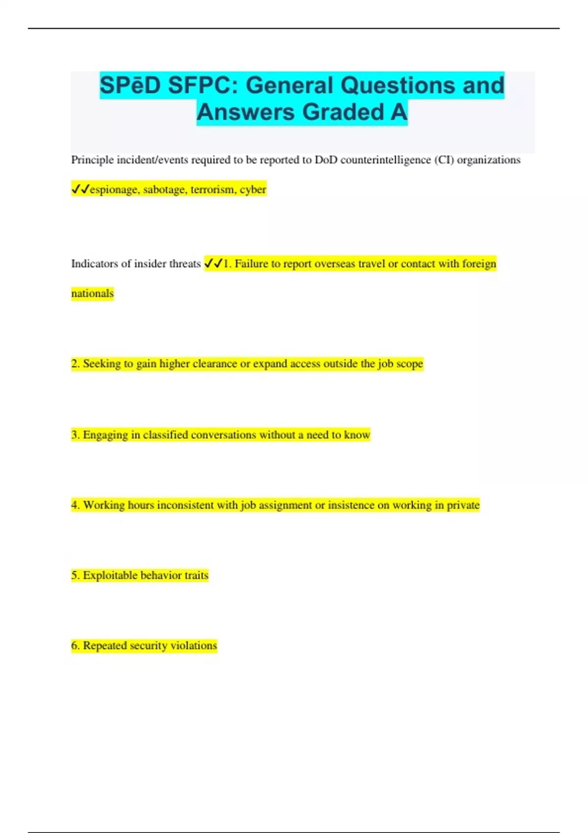 Principle incident/events required to be reported to DoD counterintelligence (CI) organizations espionage, sabotage, terrorism, cyber Indicators of insider threats 1. Failure to report overseas travel or contact with foreign nationals 2. Seeking to gain higher clearance or expand access outside the job scope 3. Engaging in classified conversations without a need to know 4. Working hours inconsistent with job assignment or insistence on working in private 5. Exploitable behavior traits 6. Repeated security violatio